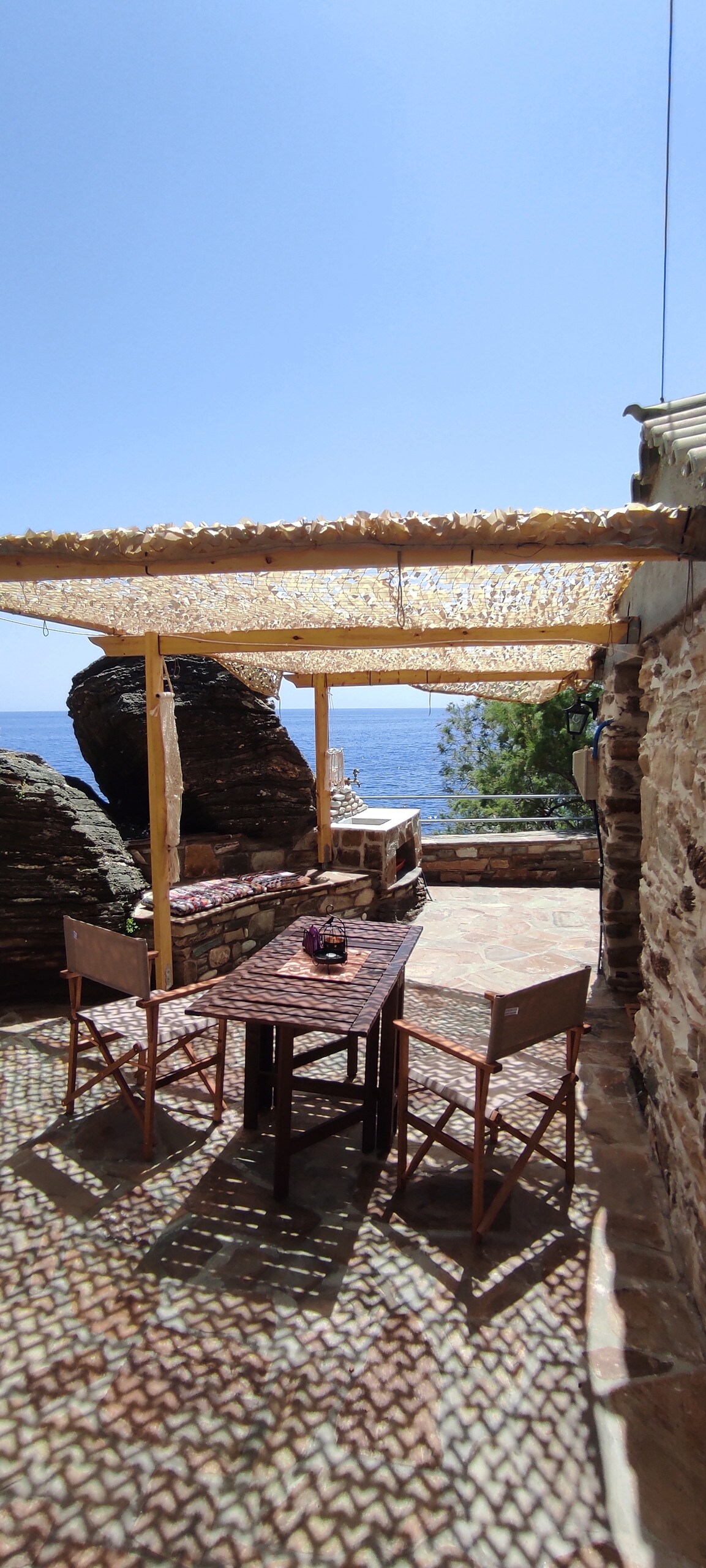 Das traditionelle Steinhaus grenzt an einer Seite an die natürliche Felswand. Das Bad ist ganz in den Fels hinein gebaut. Das ergibt ein ganz spektakuläres Wohngefühl und den Eindruck, mitten in der Natur zu sein. Die Terrasse hat eine wunderschöne Aussicht auf das Meer, den Strand von Fytema und die Berge von Messaria. Die Wohnung ist 2023 mit ökologischen Materialien im traditionellen Stil ausgebaut worden. Zum Strand sind es nur 200 m.
