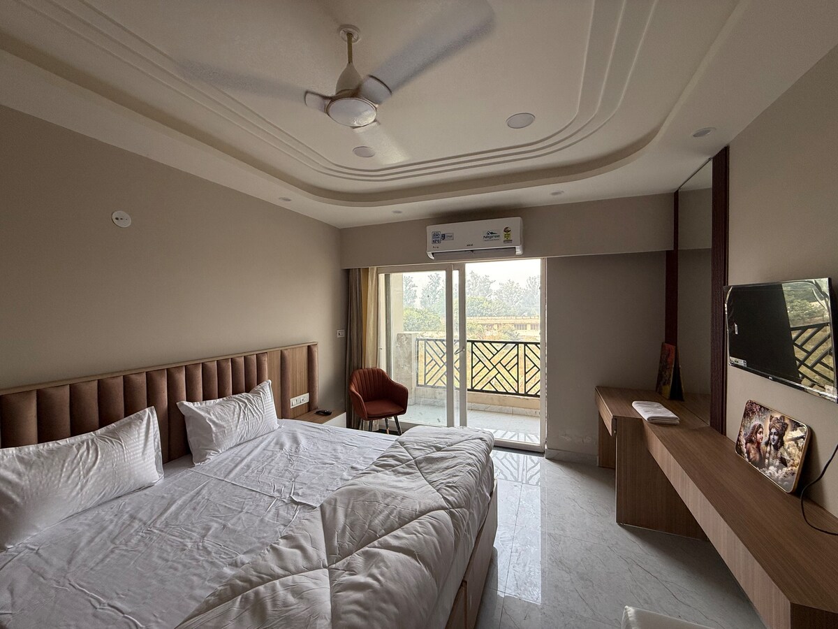 “वृंदा नेस्टचा अनुभव घ्या — वृंदावनमधील एक शांततामय सुट्टी, शहराच्या रहदारीपासून आणि गर्दीपासून दूर, राष्ट्रीय महामार्ग (वृंदावन कट) जवळ सोयीस्करपणे स्थित आणि सर्व प्रमुख आकर्षणांपासून काही मिनिटांच्या अंतरावर.” प्रेम मंदिर, इस्कॉन मंदिर आणि बांके बिहारी मंदिरापासून फक्त 5-10 मिनिटे. आध्यात्मिक प्रवासी, जोडपे किंवा कुटुंबांसाठी आदर्श. वैशिष्ट्यांमध्ये एसी, वायफाय, लिफ्ट आणि 24x7 सुरक्षा समाविष्ट आहे. दिल्लीपासून फक्त 3 तास आणि आग्रापासून 1 तास. पवित्र वृंदावनच्या मध्यभागी असलेल्या दिव्य गेटअवेसाठी योग्य.