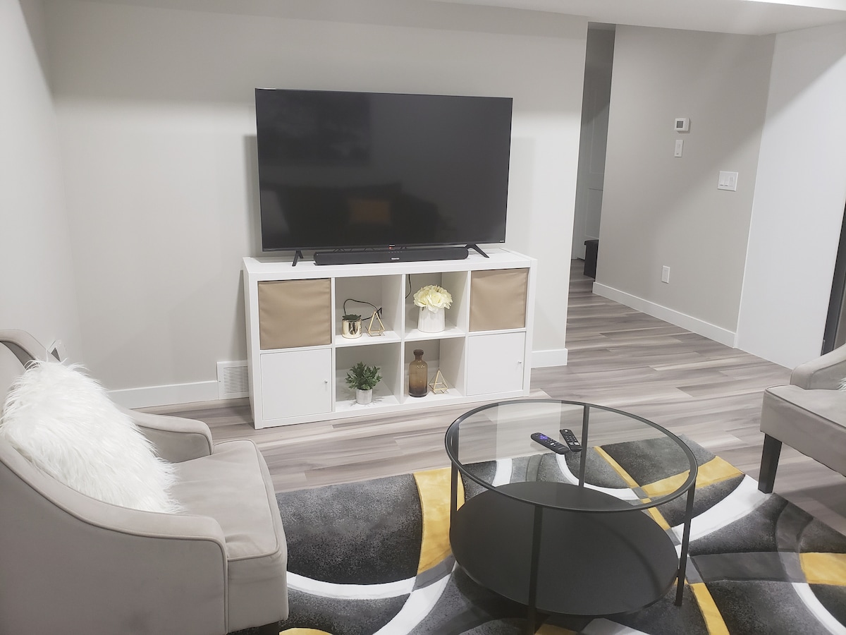 विल्यमस्टाउन एअरड्रीच्या कम्युनिटीमधील आमच्या नव्याने नूतनीकरण केलेल्या, आधुनिक तळघर सुईटमध्ये तुमचे स्वागत आहे. कीपॅड ॲक्सेससह स्वतंत्र प्रवेशद्वार वैशिष्ट्यीकृत आहे. तसेच उतरत्या आकाराचे किचन आणि लिव्हिंग एरिया, 65" स्मार्ट टीव्ही आणि फायरप्लेससह एक ओपन कन्सेप्ट फ्लोअर प्लॅन आहे. संपूर्ण सुईट तुम्हाला स्वतःसाठी मिळेल. शॉपिंग आणि अप्रतिम डायनिंग पर्यायांच्या जवळ स्थित. बॅन्फ सुमारे 1 तास 20 मिनिटांच्या अंतरावर आहे, तर एअरड्री शहरापासून फक्त 5 मिनिटांच्या अंतरावर आहे. जवळपासची तातडीची काळजी, एयरपोर्टपासून 20 मिनिटांच्या अंतरावर आणि मॉलपासून 15 मिनिटांच्या अंतरावर आहे.