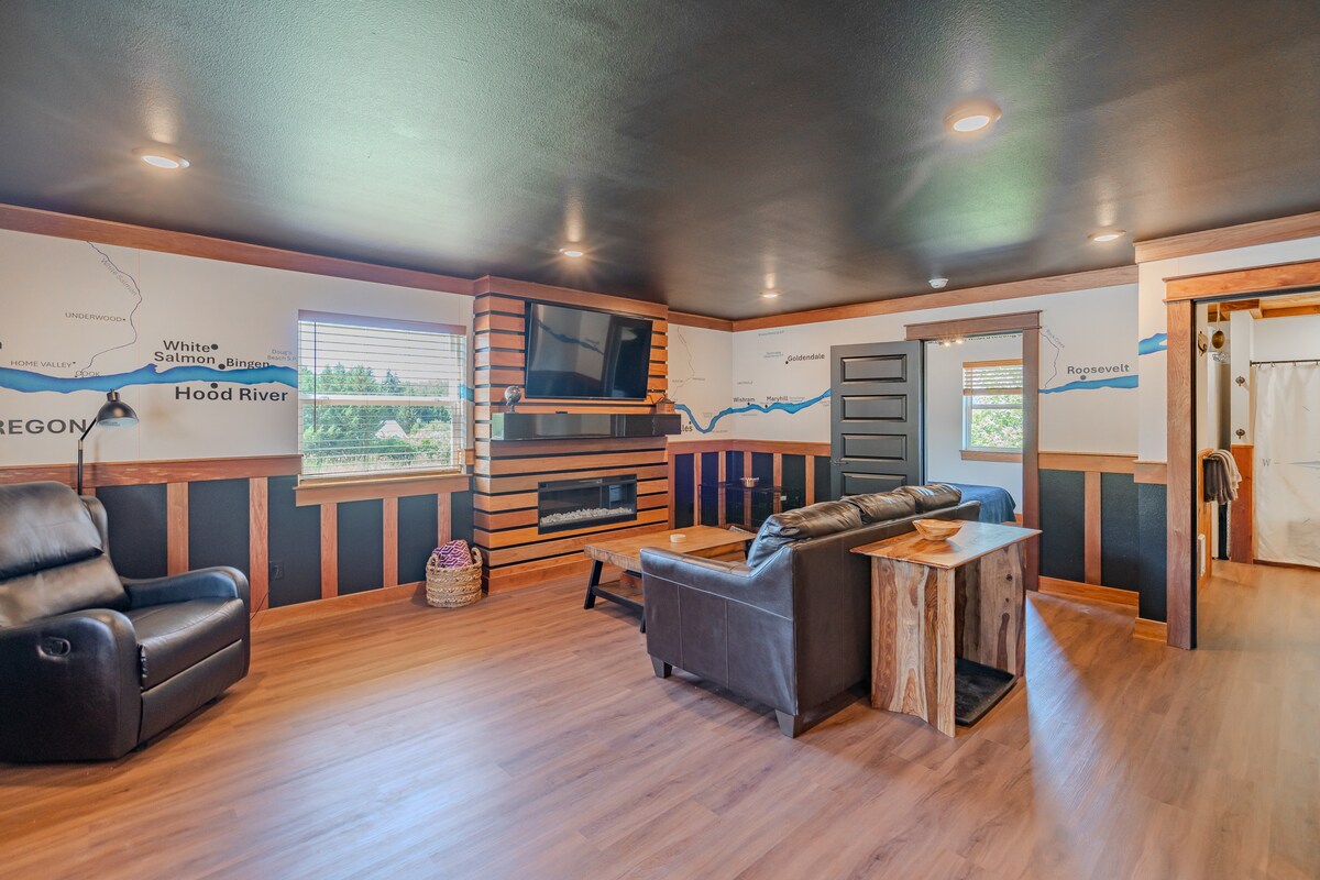 PDX पासून फक्त 28 मैलांच्या अंतरावर असलेल्या या शांत, स्टाईलिश जागेत, नदीच्या आवाजावर परत या आणि आराम करा. नदीचे सौंदर्य आणि डेकवर ताजी हवा घ्या, हायकिंग करा किंवा वाईन टेस्टिंगसाठी रस्त्यावरून चालत जा. तुमच्या बोनफायरमध्ये रहा आणि आराम करा किंवा शहरात एका रात्रीसाठी बाहेर जा. तुमच्या मित्रमैत्रिणींना, तुमच्या कुटुंबाला आणि फिडोला देखील घेऊन या. बार, एअर हॉकी, व्हिडिओ गेम्स आणि इतर बऱ्याच गोष्टींसह वरच्या मजल्यावरील गेम रूम/बार एरियाचा आनंद घ्या! आराम करा, पुनरुज्जीवन करा, तुम्ही त्यासाठी पात्र आहात! आम्हाला आता तुमच्या विशलिस्टमध्ये जोडा, जेणेकरून तुम्ही आम्हाला नंतर शोधू शकाल!