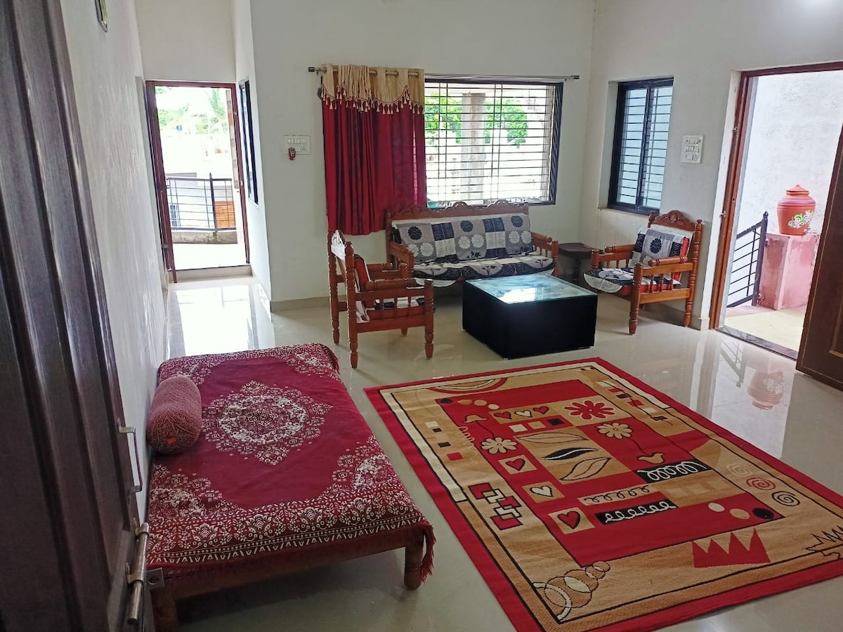 आमरावतीच्या साई नगरमधील आमच्या शांत 2 - बेडरूम, 2 - बाथरूम रिट्रीटमध्ये जा. कुटुंबे आणि तरुण प्रवाशांसाठी आदर्श, आमचे आरामदायक आश्रयस्थान सुरक्षित गेटेड सोसायटीमध्ये वसलेले आहे, जे मनःशांती आणि सोयीस्कर आहे. एअर कंडिशनिंग, फ्रंट लोड वॉशिंग मशीन आणि तुमच्या सोयीसाठी प्रदान केलेल्या भांडी असलेल्या इंडक्शन स्टोव्हसह आधुनिक सुविधांचा आनंद घ्या. प्रशस्त लिव्हिंग एरिया, 10 - सीटर सोफा सेट्स आणि स्मार्ट टीव्हीसह, विश्रांतीची हमी आहे.