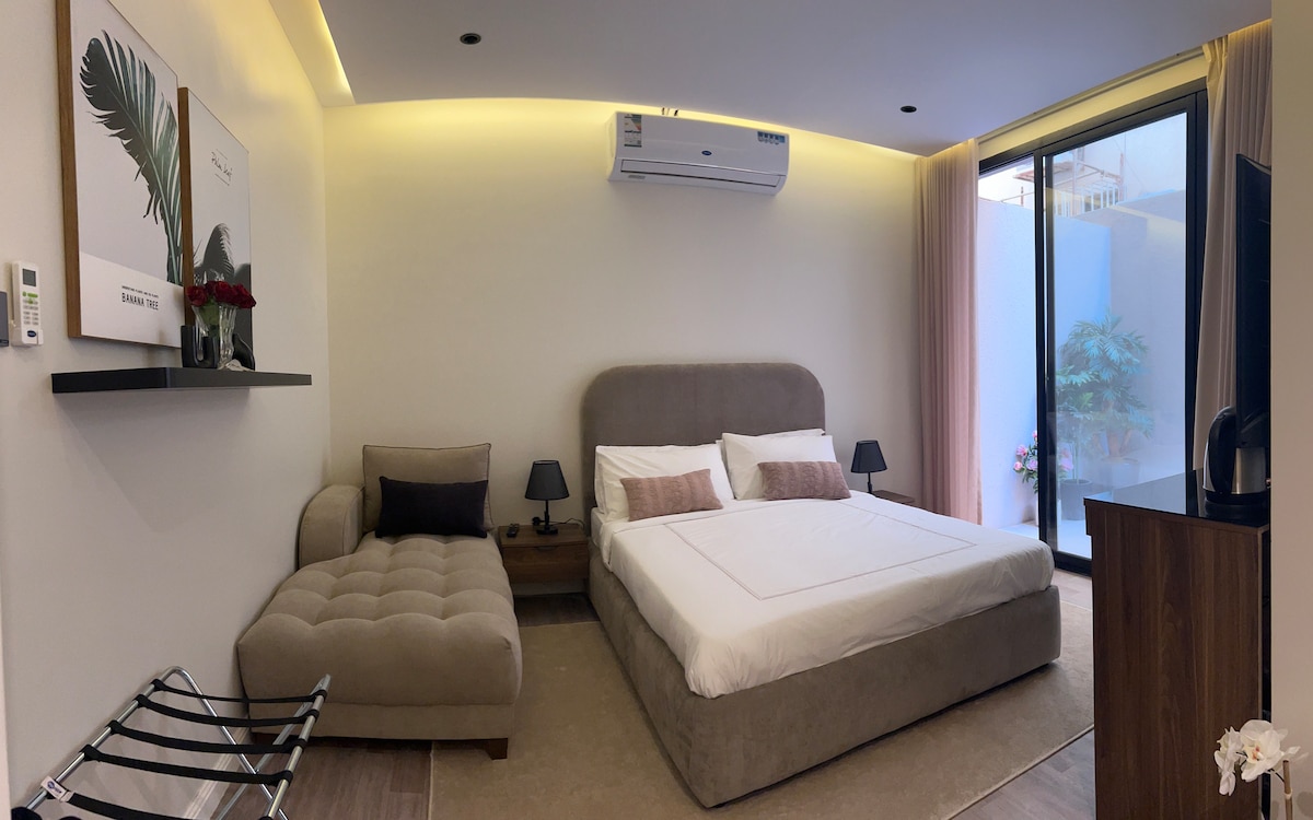 आराम आणि शांततेसाठी आरामदायक आणि सुसंगत रंग असलेला एक मोहक, लक्झरी व्हिक्टोरियन स्टाईल स्टुडिओ आणि बार्बेक्यू पॅड्सने सुसज्ज एक सुंदर आऊटडोअर सेशन. हे अल ओलाया रोड, किंग फहाद रोड, नॉर्दर्न रिंग रोड आणि सर्वात महत्त्वाची रुग्णालये आणि सरकारी केंद्रांच्या जवळ रियाधच्या मध्यभागी आहे. यात हॉटेल सेवा आणि प्रशस्त आणि मोहक जागा देखील आहेत. 65 इंच स्क्रीन, मायक्रोवेव्ह, ओव्हन, फ्रिज आणि हॉटेल केटलसह सुसज्ज. यात अधिक गोपनीयतेसाठी इंटेलिजेंट सेल्फ ॲडमिशन देखील आहे. माझ्या प्रिय गेस्टचे स्वागत करा आणि तुम्हाला आनंदी वास्तव्याची शुभेच्छा.