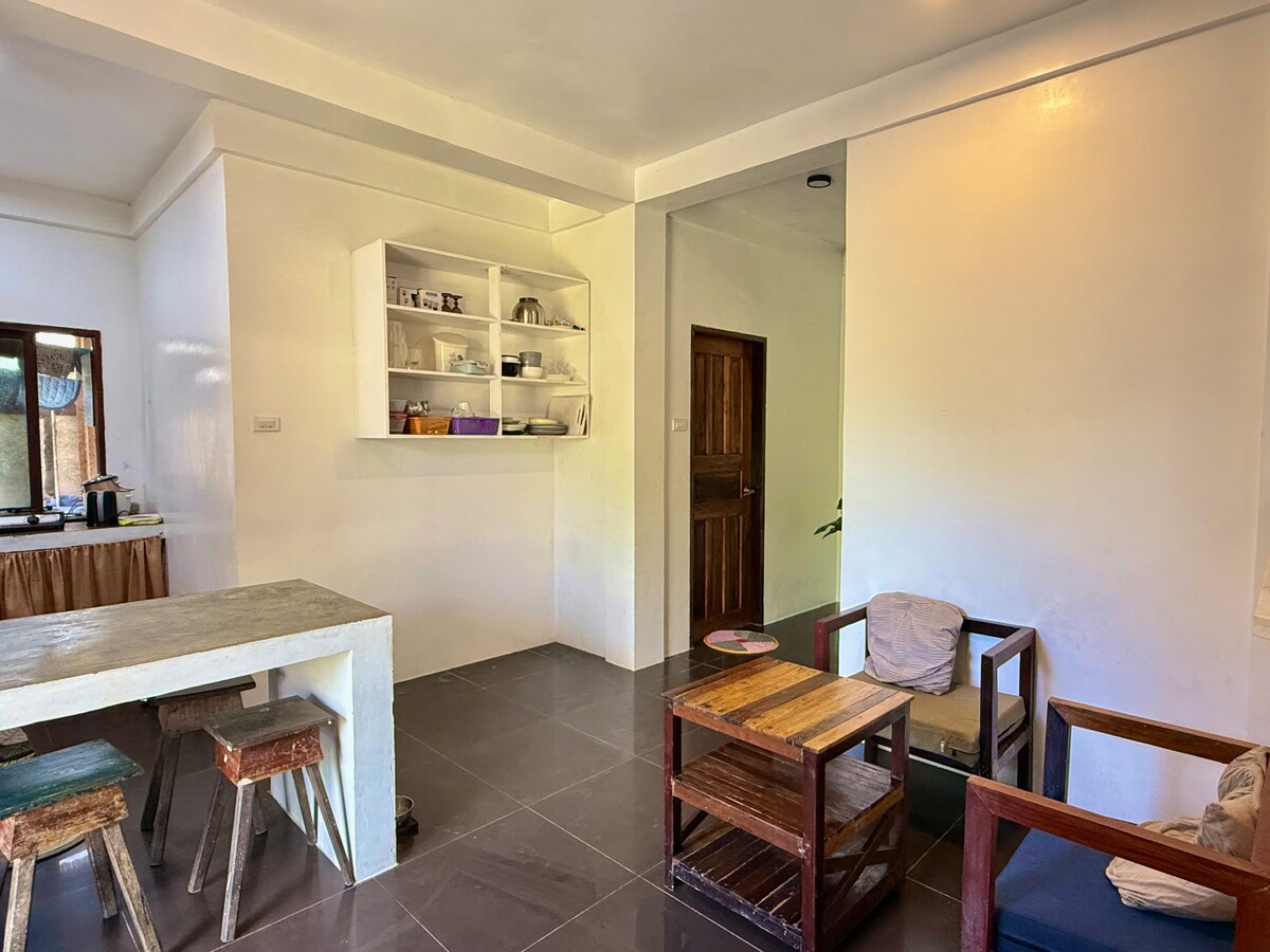 आधुनिक दिवसाची आरामदायी आणि सुविधा देणारी ट्रॉपिकल - व्हायब रूम. प्रशस्त क्वीन बेड, एअर कंडिशन आणि हॉट शॉवर. बहुतेक रेस्टॉरंट्स आणि बारपर्यंत चालत जाण्याचे अंतर. आम्ही फक्त 5 मिनिटांच्या शांत आणि शांत परिसरात आहोत - क्लाऊड 9 पर्यंत राईड करा, लोकप्रिय केर्मिट रेस्टॉरंटपासून 5 मिनिटांच्या अंतरावर आणि अनेक रेस्टॉरंट्स आणि बार असलेल्या मुख्य रस्त्यापर्यंत 10 मिनिटांच्या अंतरावर. कृपया लक्षात घ्या: हे एक विकसनशील बेट आहे, आमच्या जागेच्या मागे बांधकाम सुरू आहे. दिवसाच्या वेळी गोंगाट होतो.