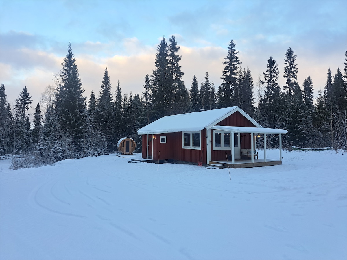 Our modern log house is situated right on a lakeshore. The open-concept design with lots of wood and light creates a warm, friendly atmosphere. On 85m2 you'll find panoramic windows with a fantastic view on the lake, a soap stone fireplace, two bedrooms and a bathroom. Enjoy fishing, paddling, swimming, hiking and x-country skiing right in front of your doorstep! Our neighbouring little farm with our kids, three sled dogs, three cats, a garden and chickens can induce a farm holiday experience.
