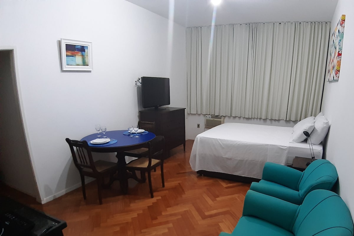 - Estudio confortável em excelente localização, com elevadores e ar condicionado, internet Wi-Fi, Smart TV com Chromecast, máquina de lavar e secar, cofre e cozinha totalmente equipada. - Entre as praias de Ipanema e Copacabana, a 4 quadras de cada - Bairro seguro e com porteiro 24h - Vista pro verde - Transporte Público (Onibus e Metrô), praias, restaurantes, bares, lojas e supermercados a distâncias caminhaveis, de poucos minutos - Ideal para casais e para viajantes a negócio - Self check-in