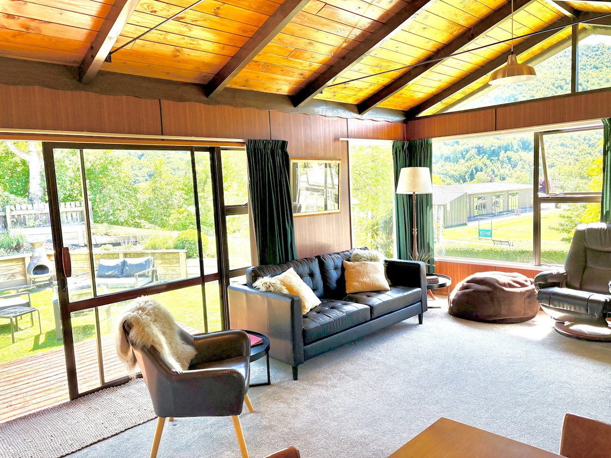 This picturesque lodge offers the best accommodation and location in Lake Wānaka. Amazing outdoor amenities . Imagine soaking in a hot tub overlooking the picturesque views of the Hawea river as you unwind and relax after a long day of fishing and adventure. An outdoor boathouse provides the perfect spot to enjoy a delectable meal as you relish the peaceful sounds of the river, native birds and bask in the serene tranquility of the surroundings. Newly renovated house, warm, family friendly .