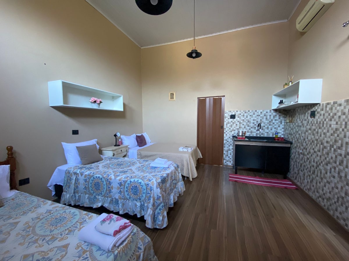 Leve toda a fam├нlia a este ├│timo lugar com muito espa├зo. Est├║dio de 30 metros quadrados localizado no centro da cidade a poucos passos de supermercado e padaria e poucas quadras das principais ruas e avenidas da cidade ├й seguro com muros altos , concertina e seguran├зa de rua noturna. Tem AR CONDICIONADO, banheiro, mesa com 4 bancos, copos, x├нcaras, , pratos, talheres, caneca de alum├нnio e um fog├гo el├йtrico de uma boca. Fornecemos roupas de cama e banho, e sabonete liquido gratuitamente.