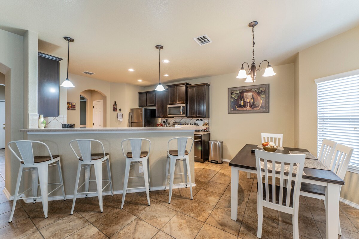 दोलायमान सॅन अँटोनियोमधील तुमच्या ग्रुपच्या स्वप्नातील सुट्टीसाठी तयार केलेल्या या मोहक 4 बेडरूमच्या आश्रयाकडे पलायन करा! हे "घरापासून दूर घर" Lackland AFB, Sea World, डाउनटाउन आणि रिव्हरवॉक, सहा फ्लॅग्ज फेस्टा टेक्सास आणि अनेक रोमांचक आकर्षणे यांच्यापासून काही मिनिटांच्या अंतरावर आहे! मुलांचे खेळाचे मैदान, रीफ्रेशिंग स्प्लॅश पॅड, शांत मासेमारी तलाव, बास्केटबॉल कोर्ट, सॉकर फील्ड आणि बेसबॉल फील्ड यासह विनामूल्य समाविष्ट असलेल्या आसपासच्या परिसरातील सुविधांचा आनंद घ्या - हे सर्व अविस्मरणीय आठवणी तयार करण्यासाठी!