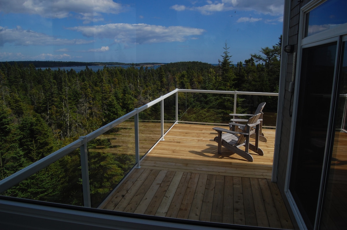 LaHave बेटावरील स्कायव्यू कार - ॲक्सेसिबल आहे, जो टेकडीवरील किल्ल्यासारख्या भव्य बेटाच्या सर्वोच्च बिंदूवर बांधलेला आहे. 2 मजली ॲट्रियम, अनेक मोठ्या खिडक्या आणि स्कायलाईट्स नयनरम्य कोव्ह, एक विस्तीर्ण उपसागर आणि विशाल अटलांटिकचे नेत्रदीपक 360 - डिग्री दृश्ये दाखवतात. काचेच्या पॅनेलसह 3 डेकवर बाहेर आराम करण्याचा आनंद घ्या. हाय - स्पीड इंटरनेट. क्रिसेंट बीच स्विमिंगपासून 5 मिनिटे, लाईटहाऊस रूटवरील मेनलँड ॲक्टिव्हिटीजपासून 7 मिनिटे, लूनेनबर्गपर्यंत 40 मिनिटे. युट्यूबवर आमचा व्हिडिओ पहा. अप्रतिम जागा!