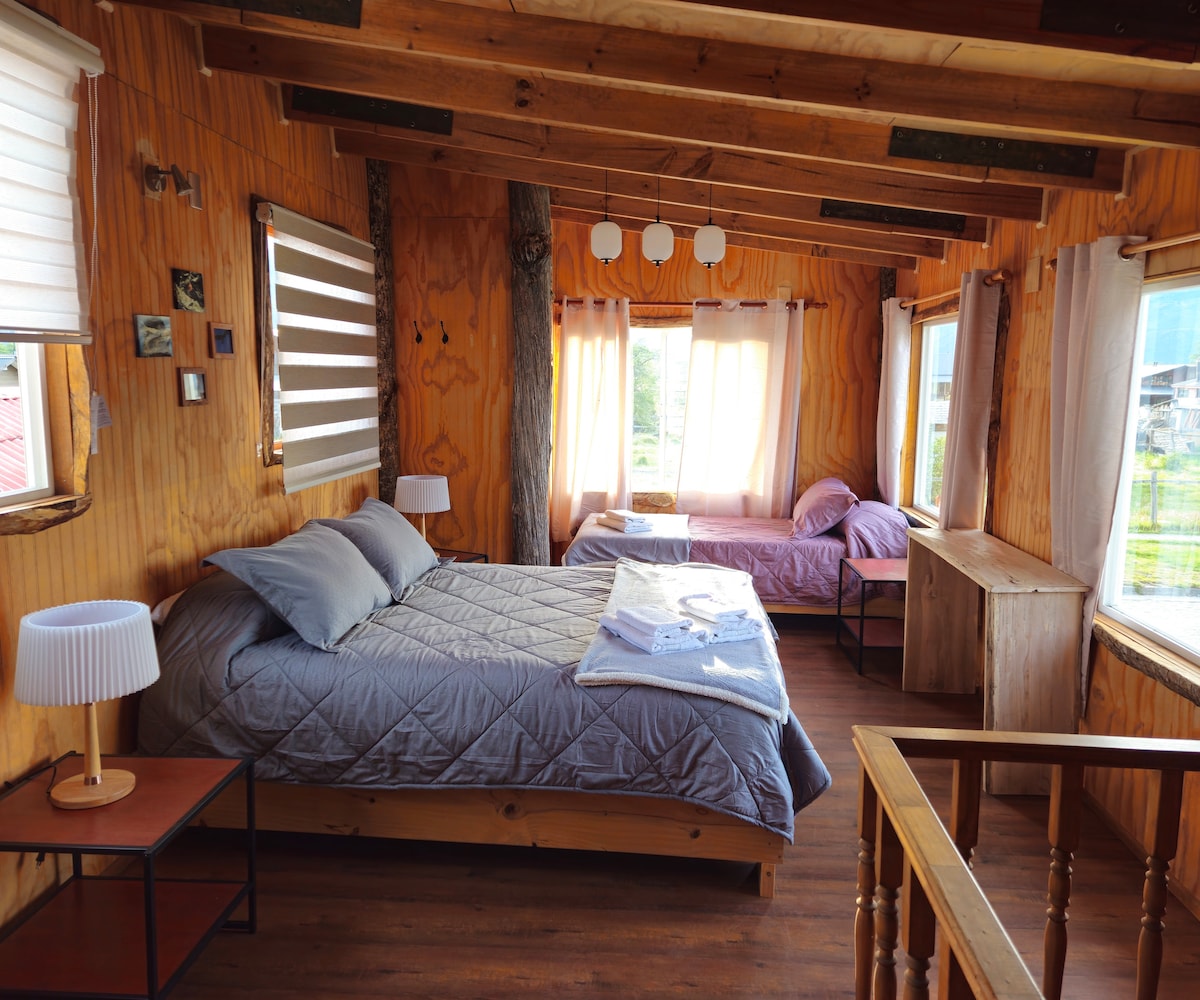 सुंदर केबिन - मार्टिन पेस्कॅडोर - 2 बेडरूम्ससह लाकडी 55 मीटर्स2 बॅज, एक डबल बेडसह 2 - प्लॅक्स बेड आणि अर्धे - सॅक आणि अर्धे बेड एक चौरस बेड. इलेक्ट्रिक रेडिएटर आणि अतिरिक्त सेंट्रल पेलेट हीटिंगसह हीटिंग. वॉशिंग मशीनसह प्रशस्त बाथरूम. सुसज्ज किचन आणि मिनी - फ्रिज. थर्मल इन्सुलेशन, लाकडी मजला आणि टर्मोपनेलमधील सर्व खिडक्या असलेले उत्कृष्ट बांधकाम. $ 7,500 चिलीयन पेसो p/p साठी ब्रेकफास्टचा.