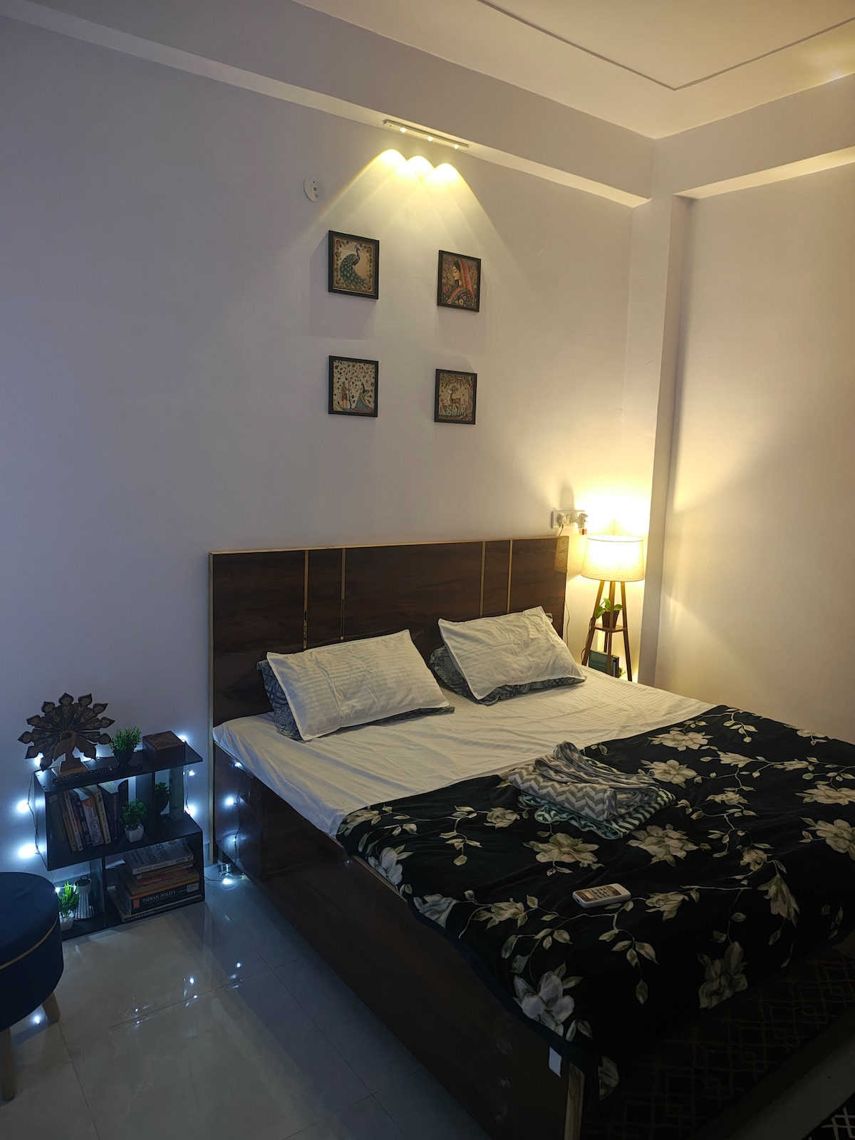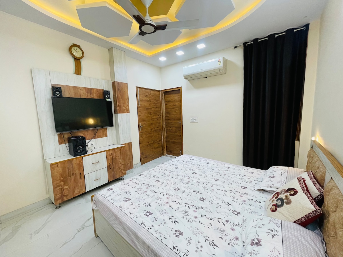 This stylish place to stay is perfect for couples and familes This is a peaceful & luxury independent floor built in 110sqyd ,located in shalimar bagh . with High speed wifi Just 2-3 mins drive for FORTIS & MAX Hospital shalimar bagh Following amenities are on walking distance Medical store Salon 10 mins drive to pacific mall nsp 10 mins drive to Elegante mall nsp 1 bedroom 1 living room Open space for relaxing Induction , Electric kettle , fridge and cuttlery are available.