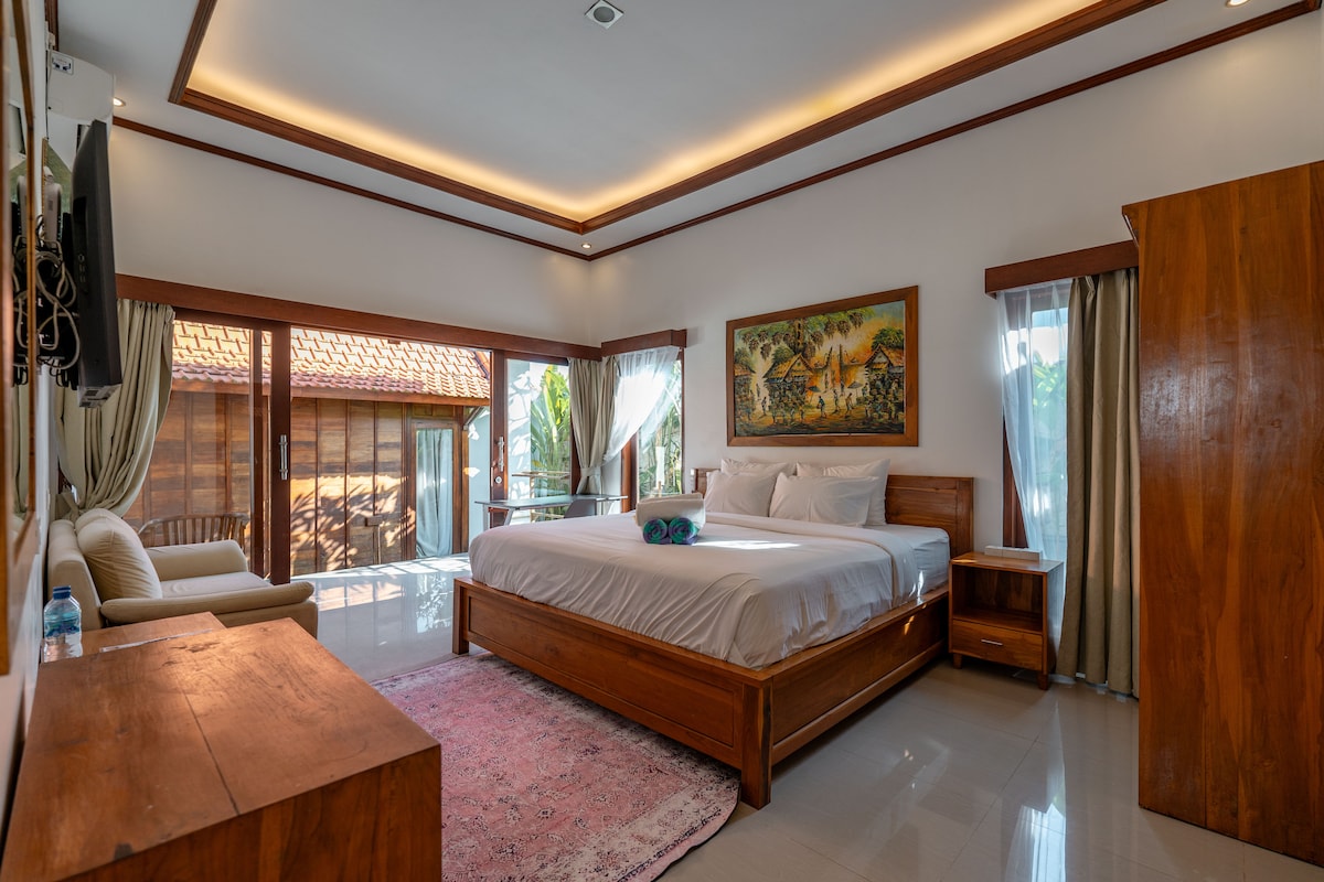 Our wooden house has a unique style, It adopts the Balinese style structure called "Lumbung" which is a rice granary in traditional Balinese culture. our bedroom is designed in a simple manner with classic and unique architecture and a bit of modern touch which will be the perfect getaway from the crowd and any glamorous things. This is one of the wooden houses in the complex. Located in the corner of the complex and just has a garden view straight from the house.