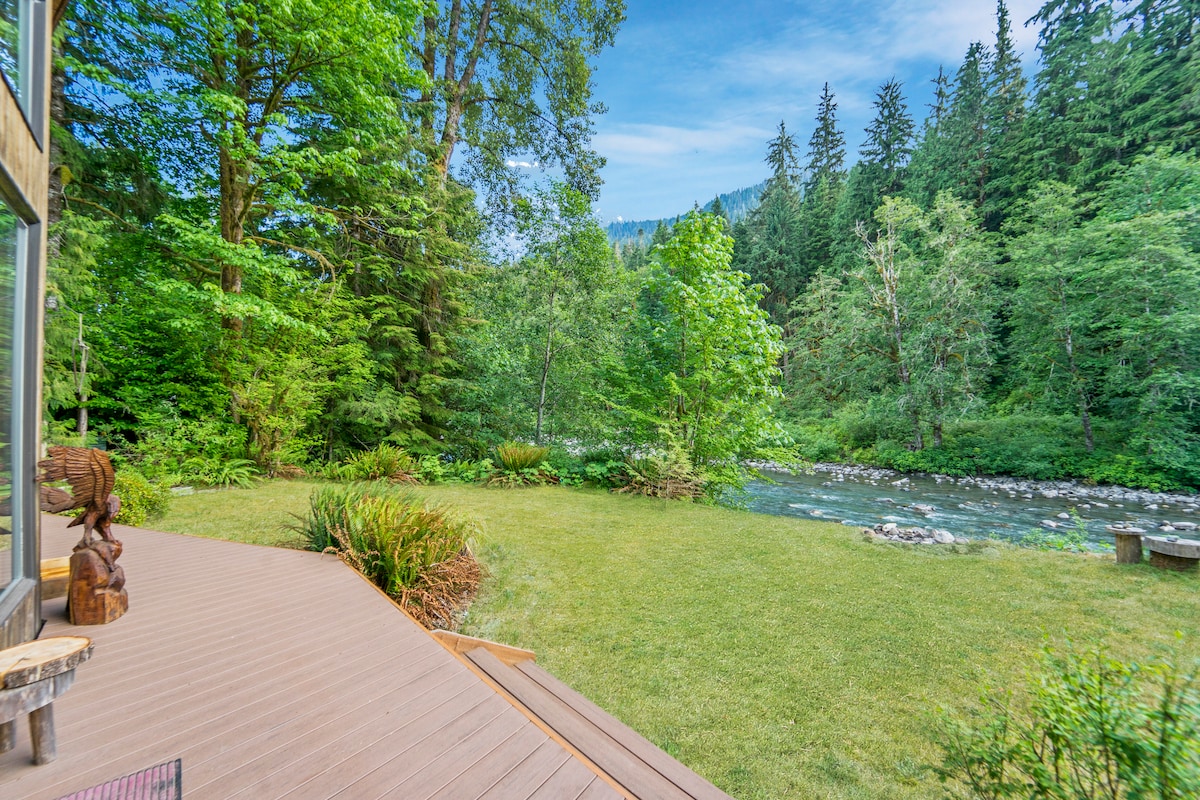 Nestled in the beautiful North Cascades, Riverside Retreat brings the tranquility of PNW. Unwind with a perfectly brewed coffee from the coffee bar, relax in the hot tub, all while admiring the rushing river and the mountain views from the property. This riverfront property near the North Cascade National Park is truly an experience, awaiting your arrival Fully equipped kitchen and bathroom, high speed wifi, indoor fireplace, outdoor firepit, game room, BBQ grill