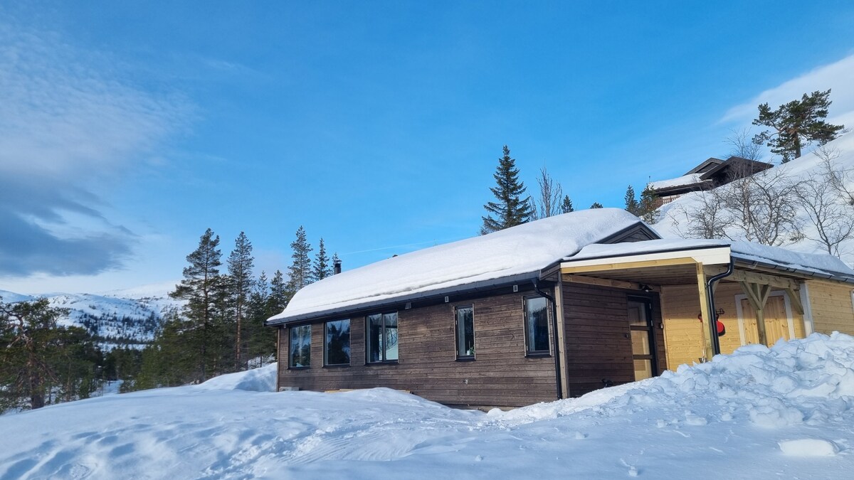 2021 पासून केबिनच्या दरवाजा, उन्हाळा आणि हिवाळ्यापासून थेट विलक्षण हायकिंगच्या शक्यतांसह नवीन बांधलेले केबिन. केबिन शेजाऱ्यापासून चांगल्या अंतरावर असलेल्या उत्तम नैसर्गिक वातावरणात गोंगाट न करता केबिन खूप निर्विवाद आणि उबदार आहे. केबिनमध्ये लिव्हिंग रूम W/फायरप्लेस आहे, सुंदर दृश्यासह एक उत्तम टेरेसचा ॲक्सेस आहे, तीन उबदार बेडरूम्स आणि फरशी आणि वॉशिंग मशीनमध्ये टाईल्स असलेले बाथरूम/लाँड्री रूम W/ हीटिंग केबल्स आहेत. बेडरूम्समध्ये हे आहे: (1) 160 सेमी बेड (2) 120 सेमी बेड खाली आणि 80 सेमी वर असलेले "फॅमिली बंक ". (3) 120 सेमी बेड खाली आणि 80 सेमी वर.