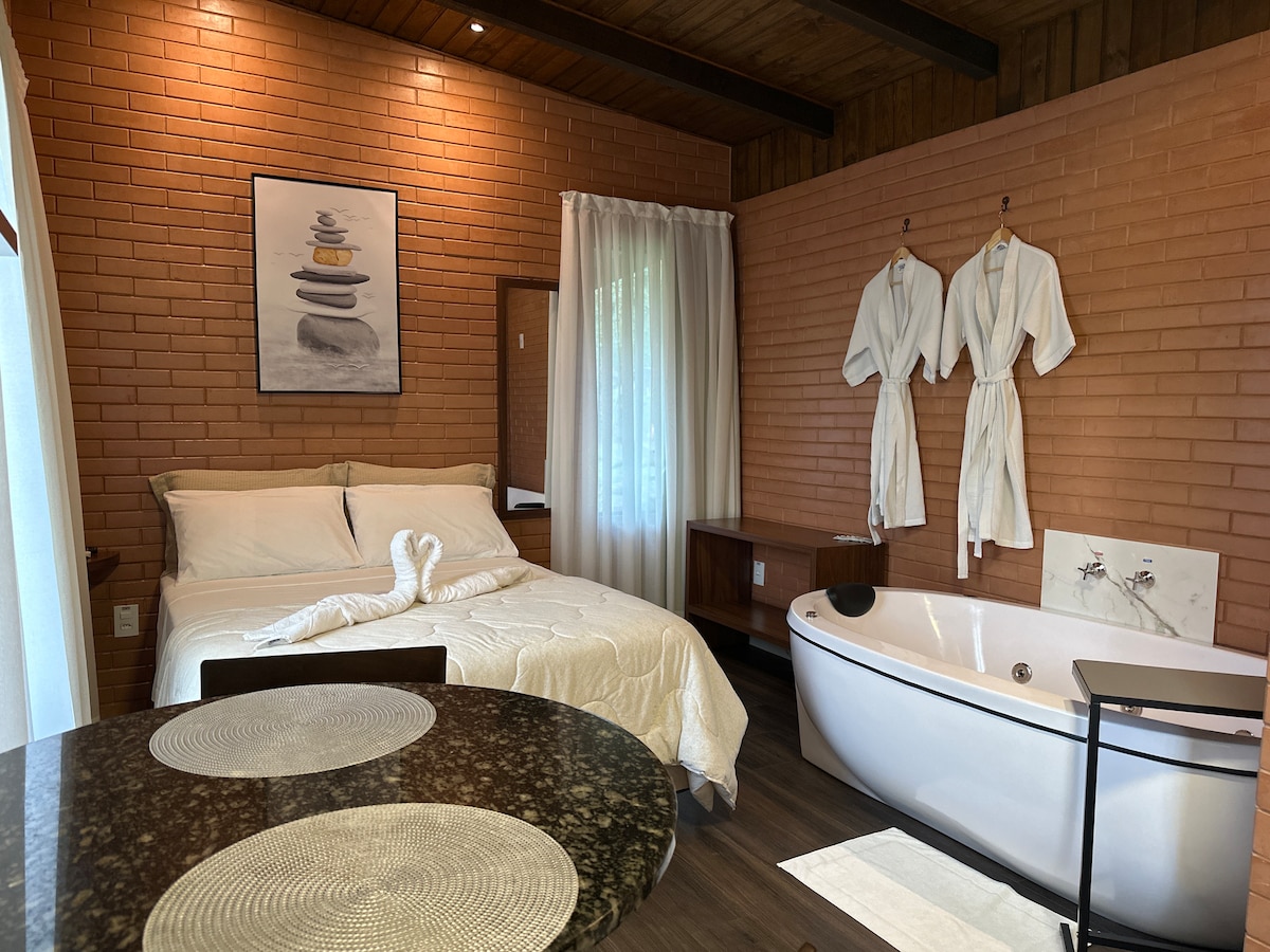 निसर्गाशी इंटिग्रेटेड रस्टिक शॅले. झाडांच्या खाली झोपण्याची, जंगलाचा आणि पाण्याचा आवाज ऐकण्याची कल्पना करा. प्राणी आणि वनस्पतींशी संबंध जोडण्याचा एक वर्णन करता येण्याजोगा अनुभव. जंगलाच्या विपुल हिरवळीसह आराम करण्याची, रिचार्ज करण्याची आणि ताज्या हवेचा आनंद घेण्याची जागा पक्षी आणि वन्य प्राणी कधीकधी भेट देतात. ॲक्सेसिबिलिटीकडे लक्ष द्या: शॅले निसर्गाच्या मध्यभागी, उंच ठिकाणी आहे. अंदाजे 50 मीटरच्या उंच टेकडीवर थोडेसे चालणे आवश्यक आहे.