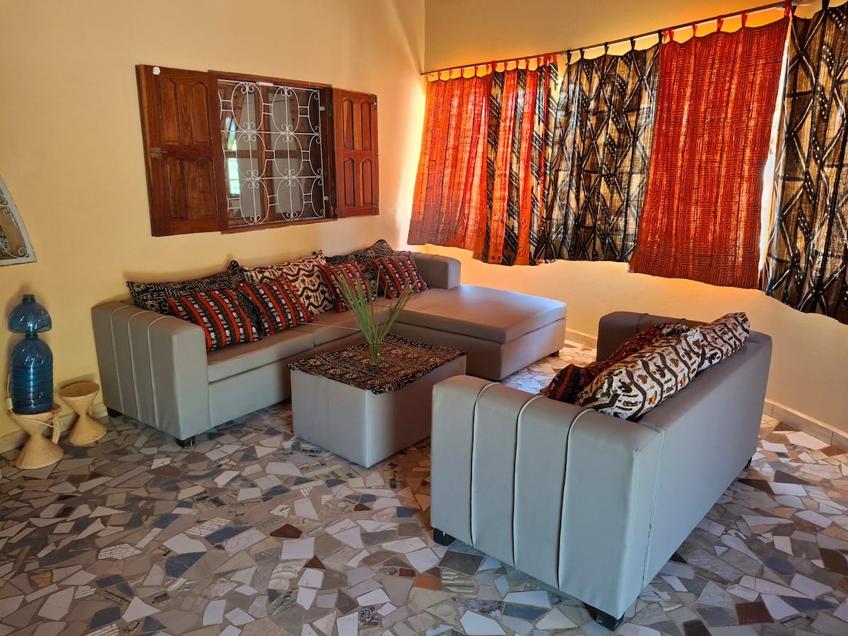 15 min Spaziergang auf schattigen Wegen f├╝hren zum Strand oder ins Dorf. Das runde Haus steht im eigenen Garten, du bist dort v├╢llig ungest├╢rt. Es ist komplett gefliest, sauber, hat Moskitoschutz an Fenstern, T├╝ren und Betten, fliessendes Wasser und Solarstrom. Eine Aussentreppe f├╝hrt auf die wundersch├╢ne, schattige Dachterasse. Das Haus ist gut f├╝r Alleinreisende, Paare, und Familien. Langzeitpreise gerne auf Anfrage. Transfer von/zum Banjul-Airport kann organisiert werden.