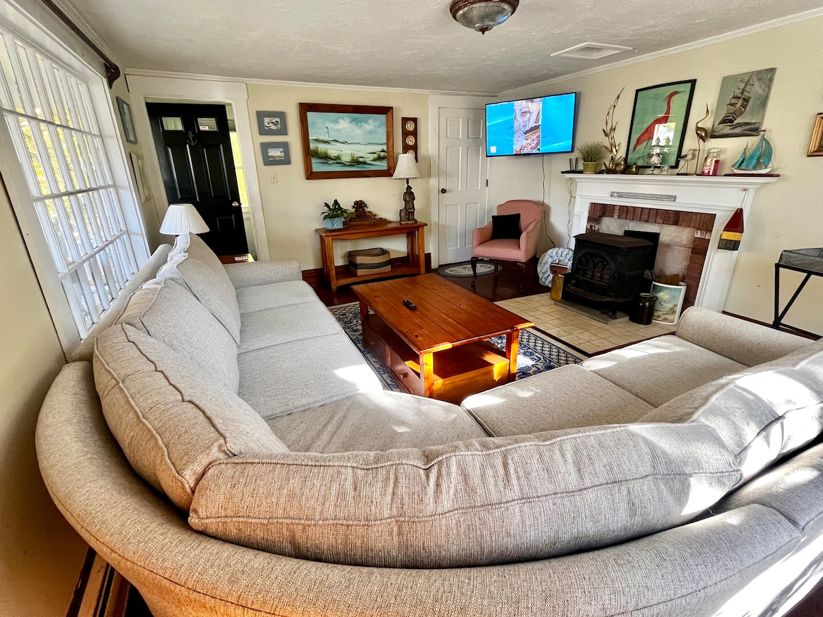 Bright, sunny, secluded, green 600 sqft studio apartment at rear of Antique home in the heart of Brewster, Northside of Rt 6A. Private entrance. Private backyard with lawn & gardens. Small private deck, gas grill. Bird and small animal life abounds outside. Tons of stars at night.. salt air on the wind. Walking distance to coffee shop, convenience store, multiple restaurants, Bike Trail. Short car ride to bay beaches, easy drive to Ocean beaches. Gas "woodstove" for heat, AC for cooling.
