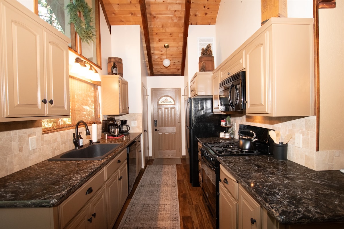 शांत आणि शांत, पूर्णपणे नूतनीकरण केलेले, बिग ट्रीजमधील शॅले. परिपूर्ण माऊंटन गेटअवेसाठी आधुनिक सुविधा अडाणी आणि व्हिन्टेजसह मिसळतात. खिडक्याच्या मोठ्या भिंतीवरून सुंदर पाईन आणि गंधसरुच्या झाडांच्या दृश्याचा आनंद घ्या. हँगिंग रतन खुर्चीवर तुमची सकाळची कॉफी प्या. सर्व सर्वोत्तम आकर्षणांसाठी फक्त काही मिनिटे! तुमच्या सोयीसाठी आमच्याकडे मुलांबरोबर प्रवास सुलभ करण्यासाठी अनेक गोष्टी आहेत! - उंच खुर्ची - पॅक एन प्ले - बेबी गेट - काही खेळणी - गेम्स - हिवाळ्यातील मजेसाठी स्लेड्स - तलावासाठी बीच टॉवेल्स