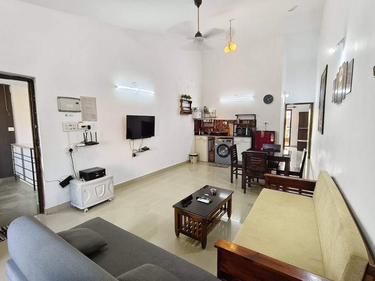 गोवा पर्यटनाद्वारे प्रमाणित 950 चौरस फूट एअर कंडिशन केलेले अपार्टमेंट: 2 बेडरूम्स, 2 बाथरूम्स, टीव्ही/लिव्हिंग रूम, ओपन किचन; लाँड्री नूक + 500 चौरस फूट नॉन - एअर कंडिशन केलेली जागा: 4 साठी डायनिंग; सनरूम सिट - आऊट; शेड पॅटीओ; ओपन - एअर बाल्कनी 300mbps इंटरनेट; 4 -5hr पॉवर बॅकअप; 50" स्मार्ट टीव्ही; पुस्तके; बोर्ड गेम्स; वर्कस्टेशन आणि कव्हर केलेली कार पार्क पोर्व्होरिममध्ये स्थित: 15 मिनिटांचा पणजी/मापुसा; 25 मिनिटांचा कॅलांगुटे/बागा; 30 मिनिट अंजुना/व्हॅगेटर; 45 -60 मिनिटांच्या अश्वेम/मंड्रेम/अरामबोल; 60 -75 मिनिट दक्षिण गोवा बीच; 120 मिनिटांचे पालोलेम