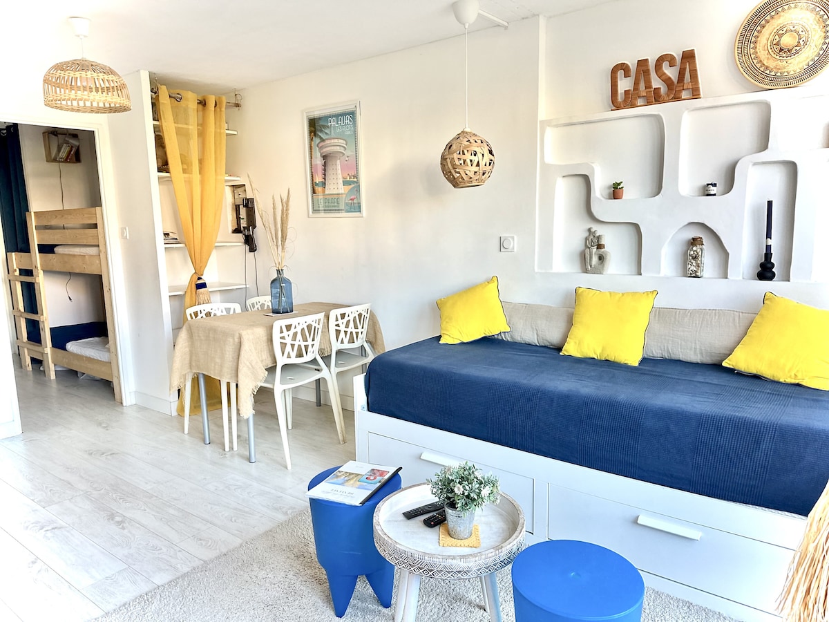पोर्ट आणि बीच दरम्यान, 2 लोकांसाठी पूर्णपणे नूतनीकरण केलेला सुसज्ज स्टुडिओ, 2 लिफ्ट्स असलेल्या निवासस्थानाच्या 7 व्या आणि शेवटच्या मजल्यावर सोफा बेड असलेली लिव्हिंग रूम, रात्रीच्या ब्लॅकआऊट पडदे बसवले गेले आहेत (शटर नाहीत) किचन सुसज्ज आणि सुसज्ज: इंडक्शन प्लेट 2 फायर, फ्रिज, सेन्सेओ कॉफी मेकर, मायक्रोवेव्ह. टॉयलेट, शॉवर, वॉशिंग मशीनसह बाथरूम खाजगी 🅿पार्किंगची जागा समाविष्ट आहे, जी उन्हाळ्याच्या हंगामात तुमच्या शांततेसाठी आवश्यक आहे कॉमन बाईक स्टोरेज उपलब्ध