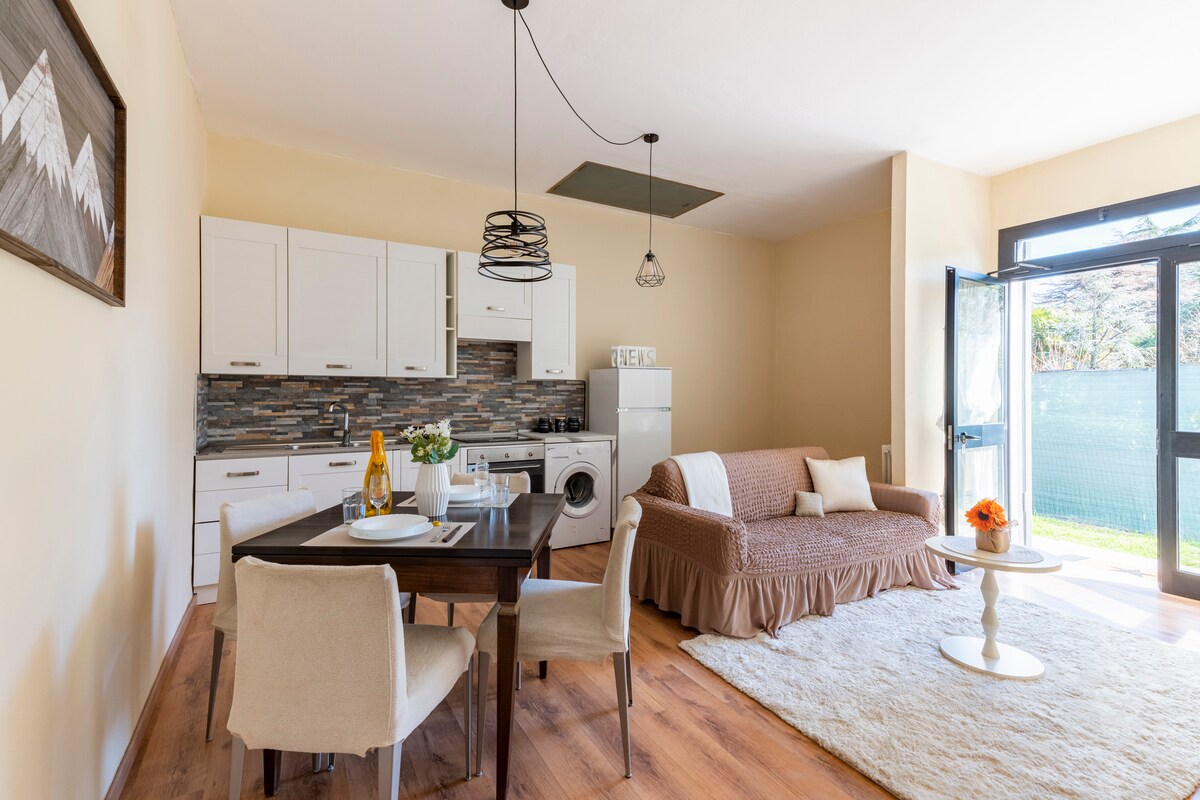 एमक्यूचे आनंददायक अपार्टमेंट. 56 पहिल्या मजल्यावर स्थित आहे आणि आरामदायक लेदर आर्मचेअर्स, अडाणी अंगभूत किचन, डबल बेडरूम, दोन सिंगल बेड असलेली बेडरूम, शॉवरसह बाथरूमसह मोठ्या आणि उज्ज्वल लिव्हिंग रूमने बनलेले आहे. आऊटडोअर डायनिंगसाठी टेबले आणि खुर्च्या असलेल्या आरामदायक जागा असलेले मोठे गार्डन. भरपूर आणि सोयीस्कर पार्किंग.