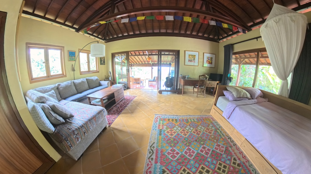 On a 10.800m2 huge property near Pakem/Kaliurang, a stylish 4/6-personsтАЩ Javanese Villa in a beautiful garden, blessed by the sound of the Boyong river dam waterfall, great views of the Merapi/Yogyakarta in the distance & by perfect cool weather. ItтАЩs my own home, available for rent for nature lovers (maximum 6 guests). Breakfast included. Jeep tours directly from the land/massages available on request. Pet-friendly, safe parking, panoramic terrace, WIFI, hot water, fire pit, Turtles' Palace.