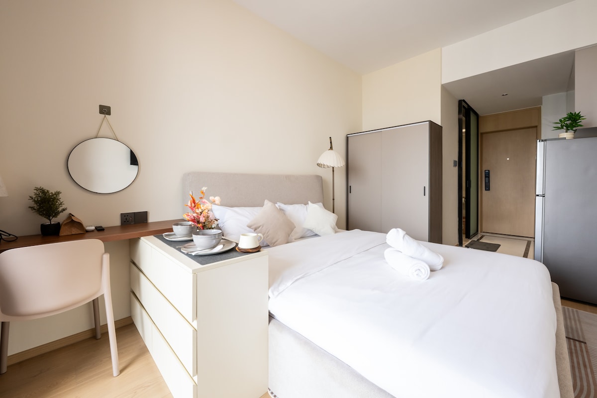 आरामदायक किंग बेड, स्वतंत्र लिव्हिंग रूम आणि संपूर्ण किचन असलेली प्रशस्त वन बेडरूम - आरामदायक किंवा दीर्घकालीन वास्तव्यासाठी परिपूर्ण. तुमच्या खाजगी बाल्कनीतून शहराच्या दृश्यांचा आनंद घ्या, जलद वायफायशी कनेक्टेड रहा आणि स्मार्ट टीव्हीसह आराम करा. यामध्ये दैनंदिन हाऊसकीपिंग आणि 24/7 फ्रंट डेस्क सपोर्टचा समावेश आहे. दुकाने, रेस्टॉरंट्स आणि आकर्षणांजवळ मध्यवर्ती ठिकाणी - घरापासून दूर असलेले तुमचे स्टाईलिश घर!