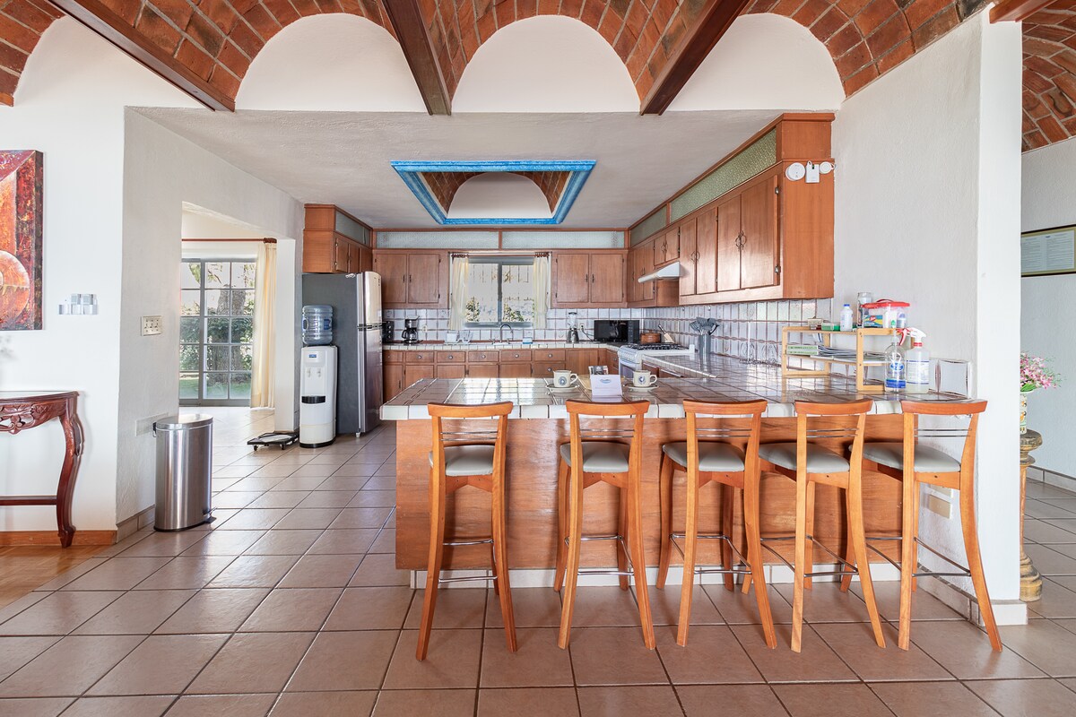असीम व्ह्यू चापाला तलावाच्या दक्षिणेकडील विस्तीर्ण दृश्यांसह एक सुंदर आधुनिक घर. सजावट समकालीन मेक्सिकन आहे. बेडरूम्स दरम्यान उत्तम प्रायव्हसी, प्रत्येकाचे स्वतःचे लक्झरी बाथरूम आहे. मोठी पॅन्ट्री आणि दोन कार गॅरेज. गॅस कुकटॉपसह सुसज्ज किचन. बार्बेक्यू. सुलभ ॲक्सेस, पायऱ्या नाहीत. 13 मीटर इन्फिनिटी पूल आणि जकूझी स्पा: गरम! गॅस फायरप्लेस. मोठ्या गुळगुळीत ऑपरेटिंग स्लाइडिंग दरवाजांसह बाहेर पडा. लक्झरी लिनन्स, पांढऱ्या फ्लफी टॉवेल्ससारखे स्पा. कलात्मक आणि सजावटीचे!