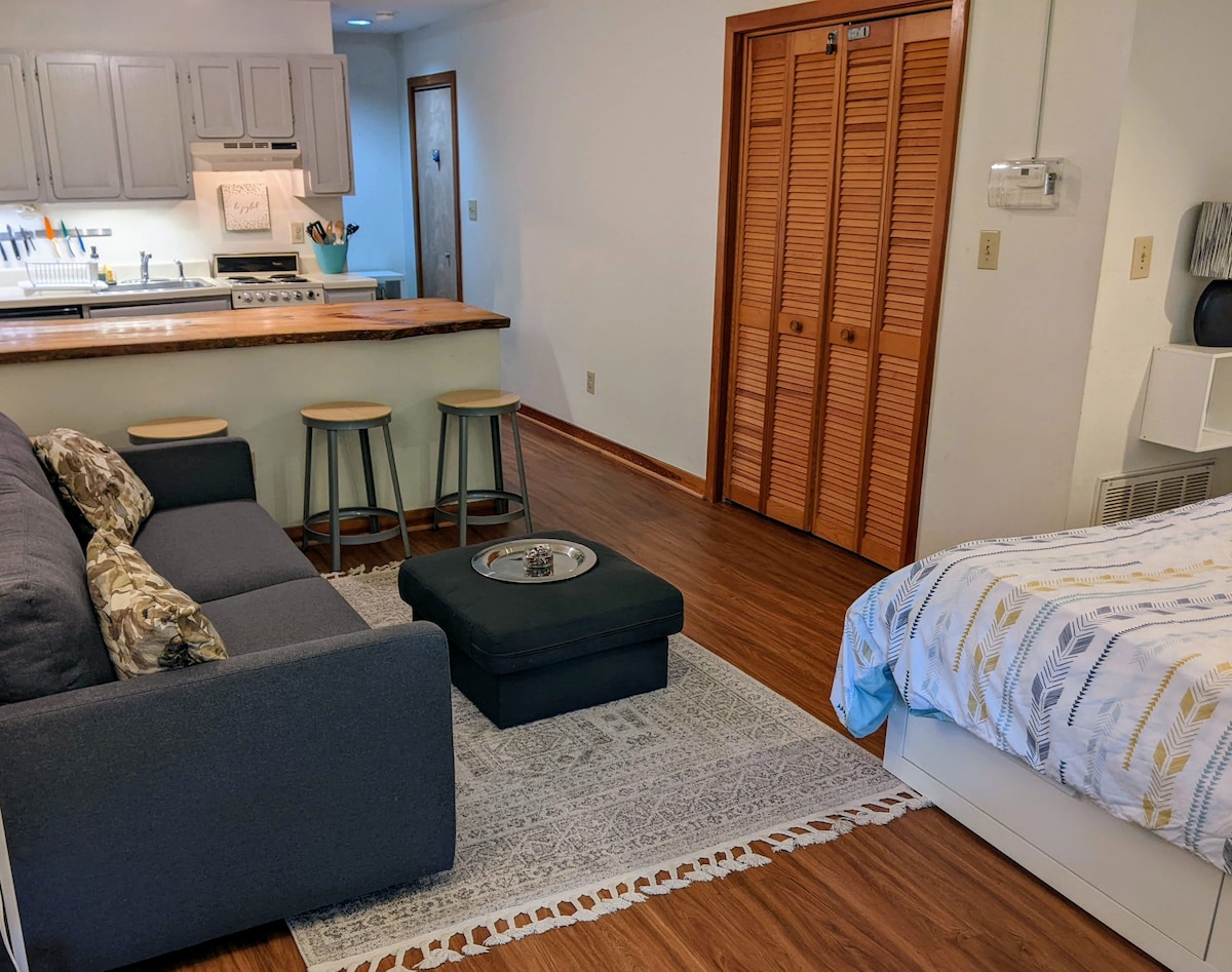 हा स्टाईलिश स्टुडिओ कार्बोरो आणि चॅपल हिल शहरापासून 5 मिनिटांच्या अंतरावर आहे. वेदरहिल टाऊनहोम्स एकाकी आहेत आणि सहज पार्किंग आहे. जास्तीत जास्त आरामासाठी एक किंग - साईझ बेड आहे आणि आवश्यक असल्यास सोफा एका अतिरिक्त गेस्टला झोपू शकतो. किचनचा आनंद घ्या आणि स्वतःसाठी बाथरूम ठेवा! हे खाजगी बेसमेंट युनिट जंगलाकडे पाहत आहे, जे वर्षाच्या कोणत्याही वेळी एक सुंदर दृश्य प्रदान करते. त्यासाठी, तुम्हाला स्क्रीन टाइम हवा असल्यास लॅपटॉप आणण्याचे लक्षात ठेवा (येथे टीव्ही नाही, परंतु खाजगी इंटरनेट आहे!).