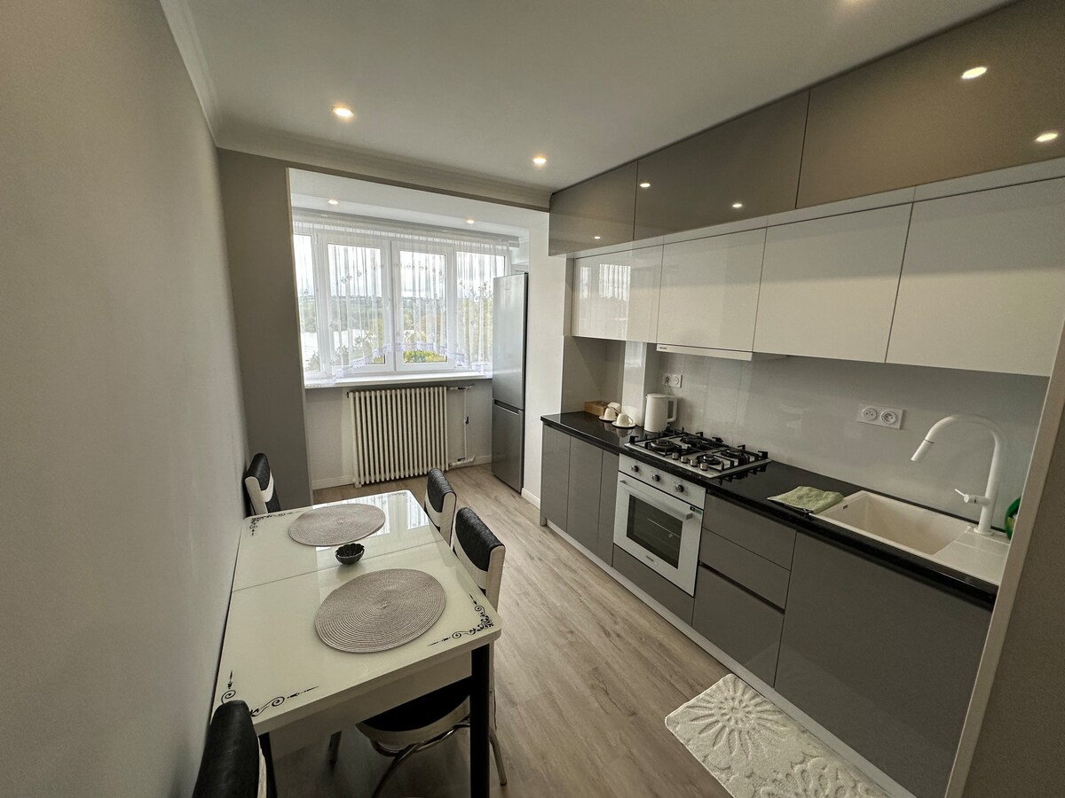 In the heart of the Botanica district a cozy and trendy flat next to the biggest park in Chisinau. The flat has: ☞ a bedroom with a queen bed ☞ a fully equipped kitchen ☞ living room with TV ☞ a bathroom The apartment has all the necessary equipment during the stay (oven, microwave, fridge, dining table, chairs, cutlery, plates, iron, etc) Sheets and towels are provided. Free Wi-Fi