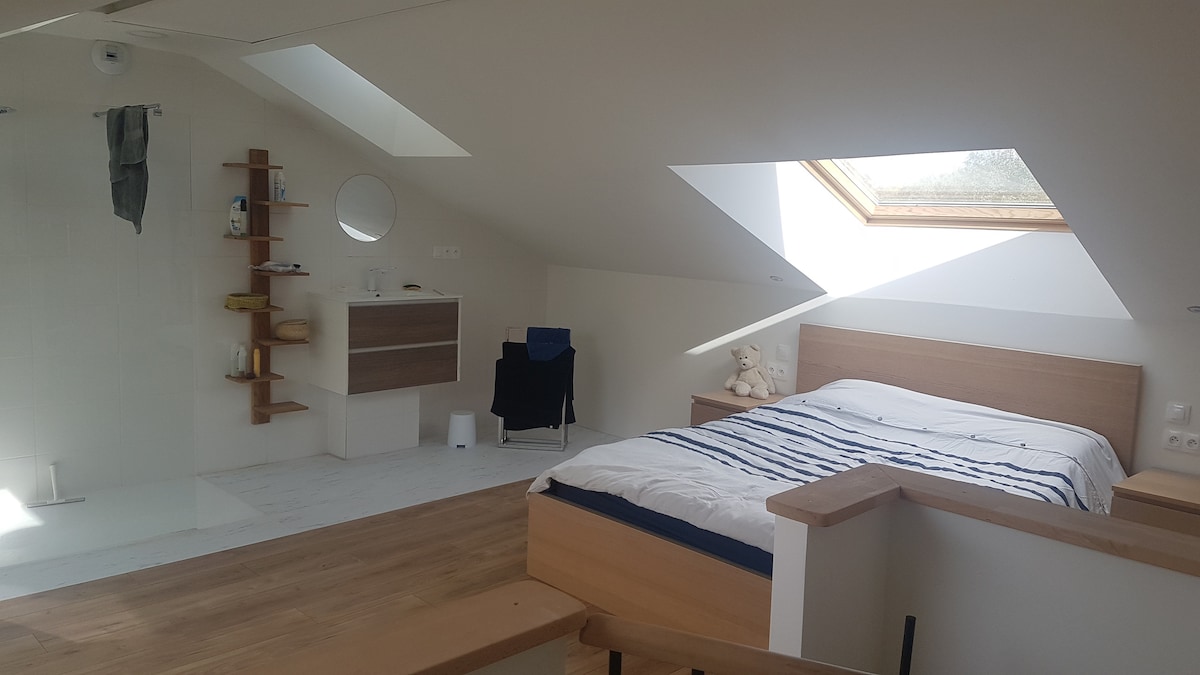 आमचे घर मुले असलेल्या कुटुंबासाठी आहे, जे जोडप्यासाठी आरामदायक आहे. - आम्ही एक स्टुडिओ ऑफर करतो: डायनिंग टेबल, मिनी बार, कॉफी मेकर, केटल. - किचन नाही - इंटरनेट - टॉयलेट आणि शॉवर - बेड (1600x2000) - बेड (1200x1900) - फक्त कुत्रे स्वीकारले जातात: आम्ही वाळवंटात 40 सेमीपेक्षा जास्त नसलेल्या प्रति वास्तव्यासाठी € 15 मागतो, या आकारापेक्षा € 30 इतके आहे. आम्ही या सहकाऱ्यांची संख्या दोनपुरती मर्यादित ठेवतो.