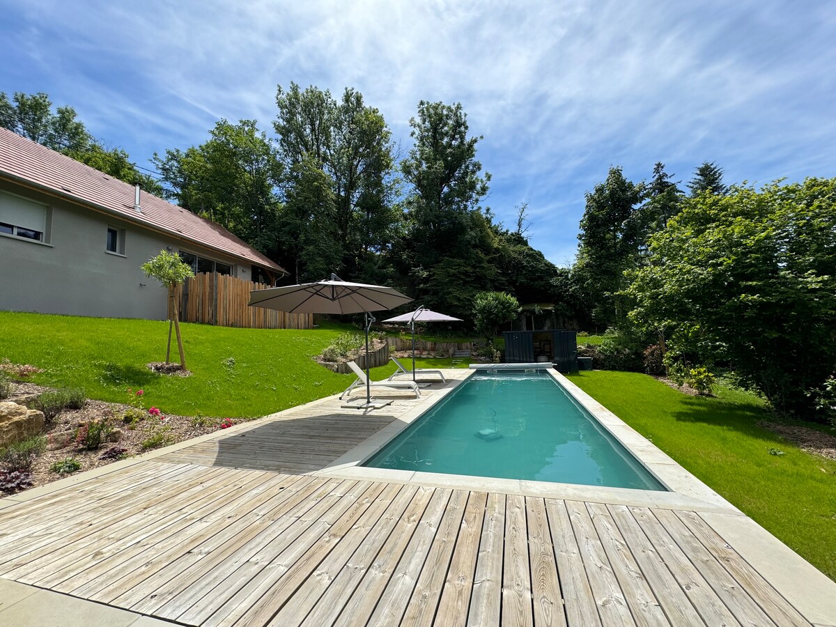"ला फ्युग मोहक: एक शांत, अनोखी आणि सुसज्ज जागा. टाऊन सेंटरमध्ये, दुकाने आणि TGV/TER रेल्वे स्टेशनपासून काही मिनिटांच्या अंतरावर (ध्वनी प्रदूषण नाही), 104 m² चे हे स्वतंत्र घर सहजपणे 6 ते 8 लोकांना सामावून घेऊ शकते. कुरण दृश्यांसह मोठे टेरेस. जुराच्या वाईन आणि फॉरेस्ट लँडस्केपच्या मध्यभागी, तुम्ही खेळ आणि सांस्कृतिक ॲक्टिव्हिटीज, स्थानिक इव्हेंट्स, स्थानिक उत्पादने आणि उल्लेखनीय हेरिटेज आणि नैसर्गिक स्थळांचा आनंद घ्याल.