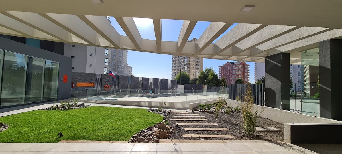 सुंदर स्टुडिओ अपार्टमेंट, नवीन, उत्तम दृश्य, तसेच स्थित बिल्डिंगमध्ये, खाजगी पार्किंग. चांगली कनेक्टिव्हिटी. महामारीमुळे प्रतिबंधित वापर असलेले आऊटडोअर आणि समशीतोष्ण पूल. ते खुले आहेत परंतु उपलब्धता क्षमतेच्या अधीन आहे, सध्या याची हमी दिली जाऊ शकत नाही