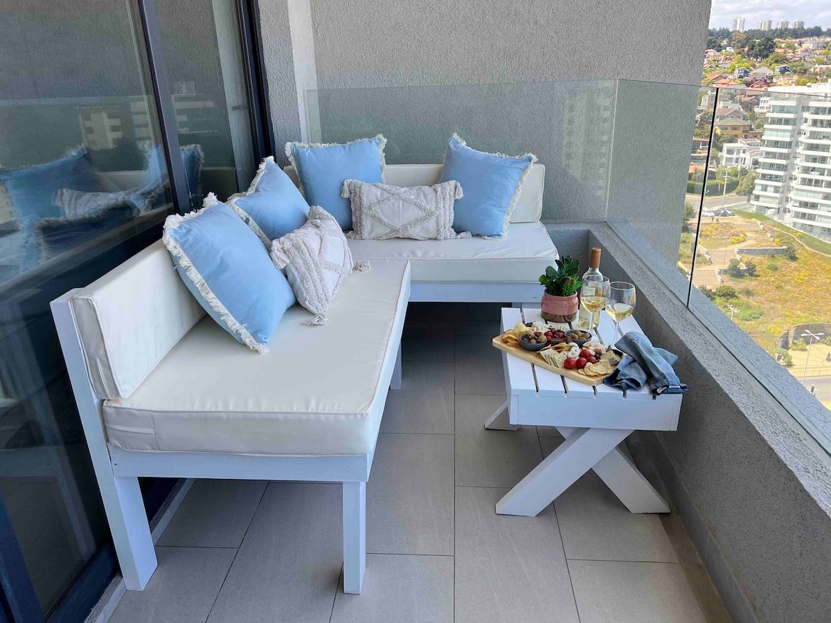 समुद्राचे आणि वालपारेसोच्या उपसागराच्या सुंदर दृश्यासह, त्याच्या काचेच्या बंद झाल्यामुळे वर्षाच्या कोणत्याही वेळी सुसज्ज असलेल्या 29 मीटर2 च्या मोठ्या टेरेसवरून, एका विशेष ठिकाणी या आणि आनंद घ्या आणि आराम करा. कॉनकॉन आणि पार्क ला फॉरेस्टाच्या सुंदर ड्यून्सपासून दूर, विविध रेस्टॉरंट्स आणि शॉपिंग व्हेन्यूज. अपार्टमेंटमध्ये 2 बेडरूम्स, 2 बाथरूम्स, किचन आणि लिव्हिंग रूम सुसज्ज आहेत. इमारतीच्या कॉमन जागांमध्ये तुम्हाला पूल्स, सॉना, क्विंचो, जिम आणि इतर गोष्टी मिळतील.