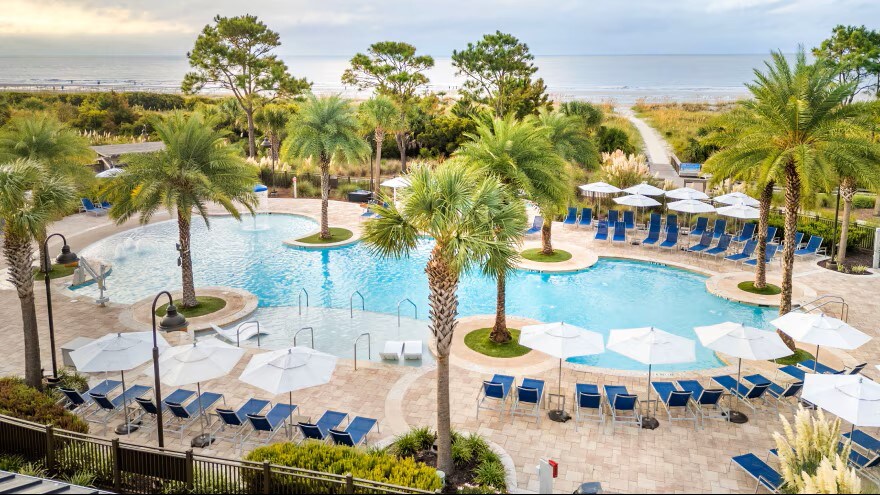 Experience coastal luxury at Marriott's Grande Ocean, perfectly positioned on Hilton Head Island's pristine beachfront. This premier resort offers direct access to miles of sandy beaches and Atlantic waters. Features multiple pools, hot tubs, and seasonal activities. Minutes from world-class golf courses, tennis courts, and cycling paths. Perfect location for exploring the island's natural beauty, upscale dining, and shopping at Coligny Plaza.