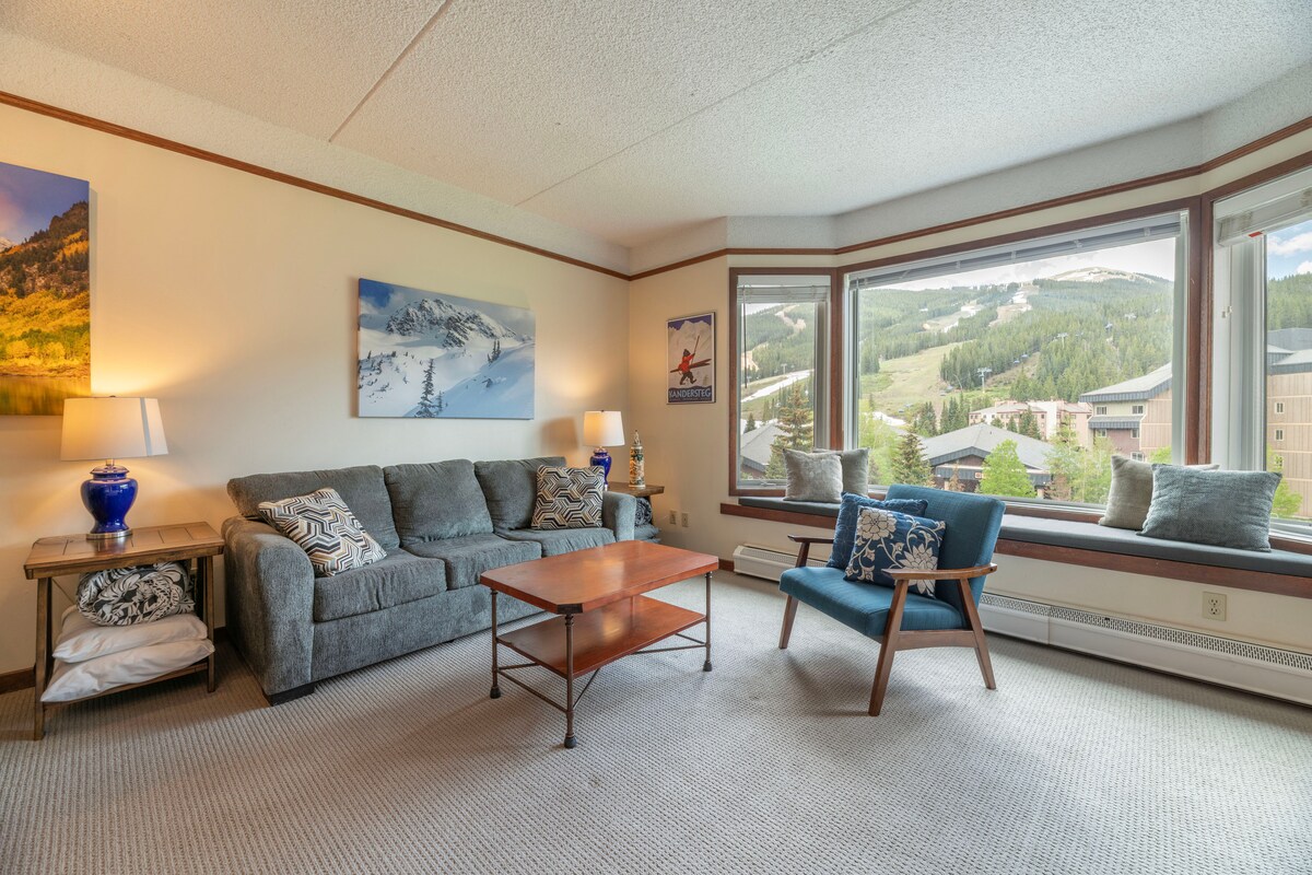 सेंटर व्हिलेजमधील अमेरिकन ईगल लिफ्टच्या दृश्यांसह अपडेट केलेले स्लोप-साईड काँडो. ऑन-साईट पार्किंग, लिफ्ट ॲक्सेस आणि स्लोप-साईड स्की लॉकरसह खरी स्की-इन/स्की-आउट. 6 बेड्ससह 6 जणांना झोपता येते: लॉफ्ट किंग, कॅल किंग विंडो बेड, कन्व्हर्टिबल लेदर डेबेड (दोन ट्विन XLs), तसेच दोन ट्विन फ्लोअर मॅट्रेसेस. दक्षिण दिशेला असलेली सनी डायनिंग नुक, व्हॉल्टेड सीलिंग्ज आणि एक आरामदायक गॅस फायरप्लेस. कृपया लक्षात घ्या: लॉफ्ट खुले आहे आणि सर्पिल पायऱ्यांद्वारे प्रवेश करता येतो.