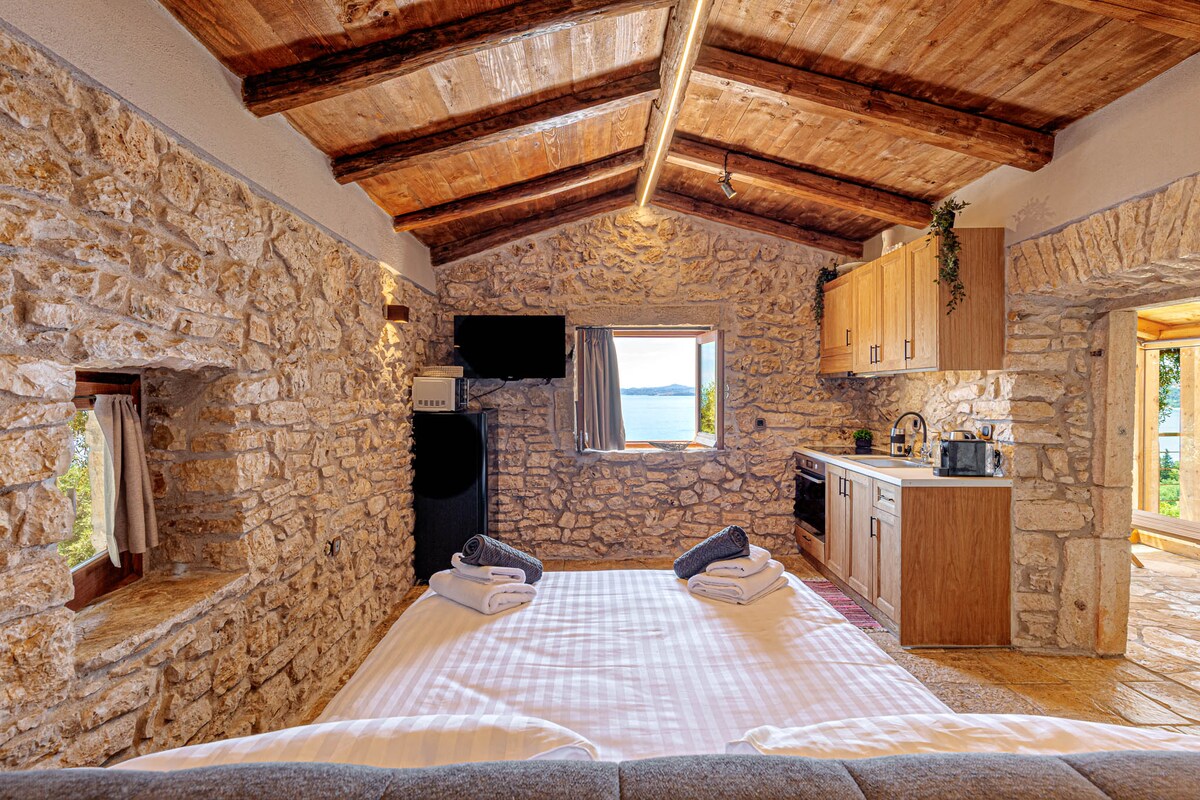 स्टुडिओ अगदी बीचवर आहे, अगदी शांत भागात. ही जागा संपूर्ण प्रायव्हसी देते. घराच्या अगदी समोरचा बीच फक्त तुमच्यासाठी आहे. समोर एक मोठा व्हरांडा आहे जो अंतहीन निळ्या रंगाकडे अमर्याद दृश्यासह आहे. मागे एक लहान ऑलिव्ह ग्रोव्ह आहे ज्यात आरामदायक पार्किंग, एक बार्बेक्यू आणि एक लहान भाजीपाला गार्डन आहे जे त्याची सर्व उत्पादने गेस्ट्सना विनामूल्य ऑफर केली जातात. ही जागा अनोखी आहे, आराम आणि शांत सुट्टीसाठी आदर्श आहे.