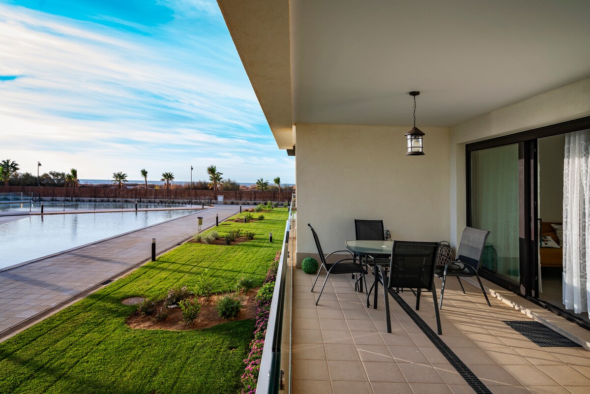 पूल, बार्बेक्यू आणि पॅडलसह 6 गेस्ट्सचे अपार्टमेंट
