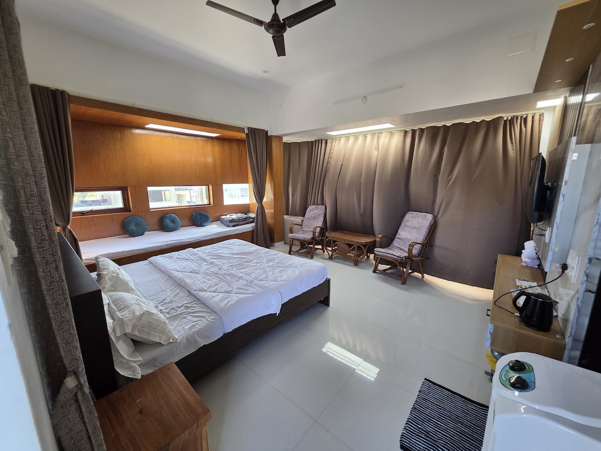 Unwind with your family at this tranquil location. 3 adults and children's can fit in this area with ease. There are currently no elevators installed, and this is on the third floor. In front of the front door is an open terrace on this 1BHK house. The distance from Shimoga Railway station is 4.3 km. 11-minute drive in an automobile. There are cooking supplies accessible. 1 Extra bed is available for additional guests.