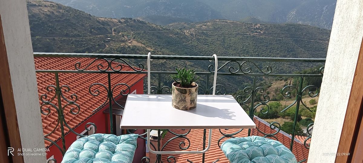 फायरप्लेस आणि एक अप्रतिम व्हरांडा असलेले जादुई दगडी घर. एका जोडप्यासाठी किंवा मित्रमैत्रिणींच्या ग्रुपसाठी आदर्श. मोठा व्हरांडा माऊंट पार्नाससचे अविश्वसनीय दृश्ये ऑफर करतो, रोमँटिक आणि अविस्मरणीय क्षणांसाठी परिपूर्ण सेटिंग तयार करतो. थंड हिवाळ्याच्या रात्री फायरप्लेसच्या उबदारपणाचा आनंद घ्या आणि उन्हाळ्यात ताज्या हवेसह सुंदर अंगणात आराम करा. हे घर पारंपारिक ग्रीक आर्किटेक्चरला सर्व आधुनिक सुविधांसह एकत्र करते, ज्यामुळे तुम्हाला नयनरम्य लँडस्केपमध्ये आराम मिळतो.