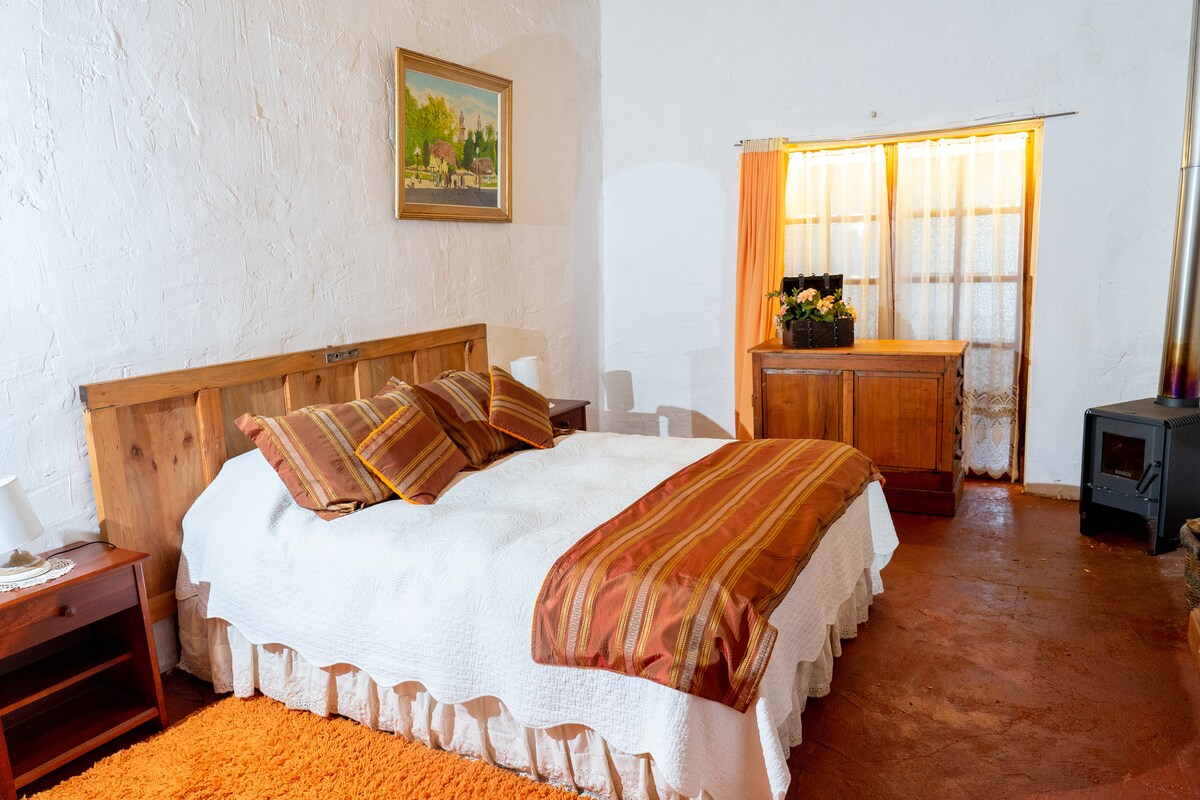Encantadora habitación doble matrimonial en una casona colonial, con estufa a combustión lenta y baño privado en suite. Vista a jardines, piscina y corredor posterior. Incluye desayuno y acceso a quincho, piscina, corredores y amplios jardines. A solo 1,5 km de la Ruta 5.