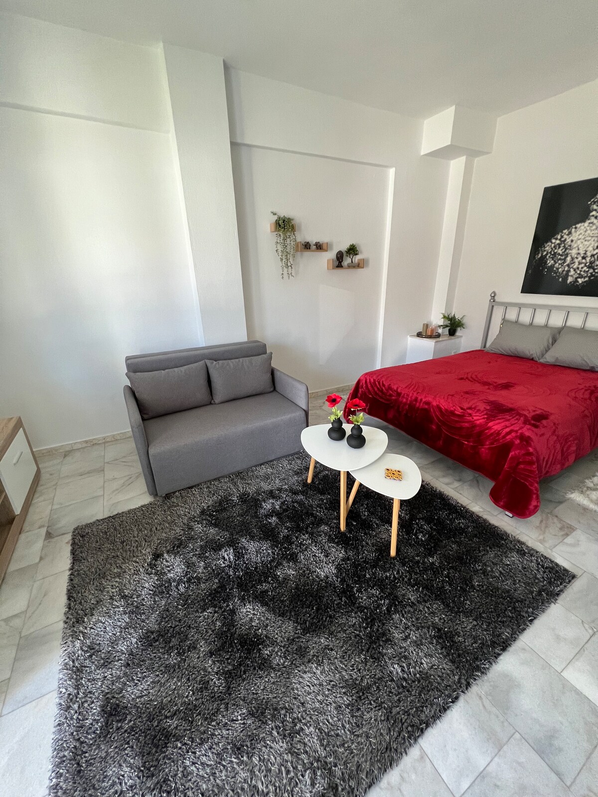 शांत परिसरातील एक पूर्णपणे सुसज्ज स्टुडिओ, शहराच्या मध्यभागी, सुपरमार्केट, बेकरी, खेळाचे मैदान, उद्यान, आपल्या मुक्कामास सुलभ आणि अधिक आरामदायक बनवण्यासाठी आवश्यक असलेल्या सर्व सुविधांसह. यामध्ये एअर कंडिशनर आणि स्वतंत्र हीटर देखील आहे. वायफाय स्मार्ट टीव्ही 24/7 गरम पाणी