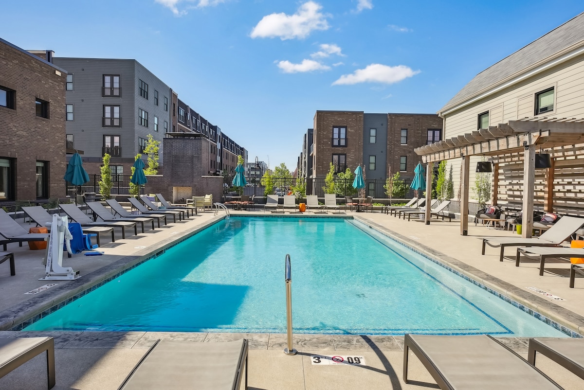 केनियन स्क्वेअर अपार्टमेंट्समध्ये संपूर्ण अपार्टमेंट तुमच्याकडेच असेल. तुमच्या अपार्टमेंटमध्ये पूर्ण - आकाराचे वॉशर/ड्रायर, तसेच महोगनी - शैलीतील कॅबिनेटरी, नऊ फूट छत, ब्रश केलेले निकेल हार्डवेअर आणि लाइटिंग, बाथरूमच्या भागात सिरॅमिक फ्लोअरिंग आणि किचन/डायनिंगच्या जागांमध्ये लाकूड - फिनिश फ्लोअरिंग आहे. तुमच्याकडे 24/7 जिम, पूल आणि क्लबहाऊसमधील सभोवतालच्या ध्वनी संगीताचा तसेच आऊटडोअर लाउंजमधील फायर पिट आणि ग्रिलिंग पॅव्हेलियनचा ॲक्सेस असेल.