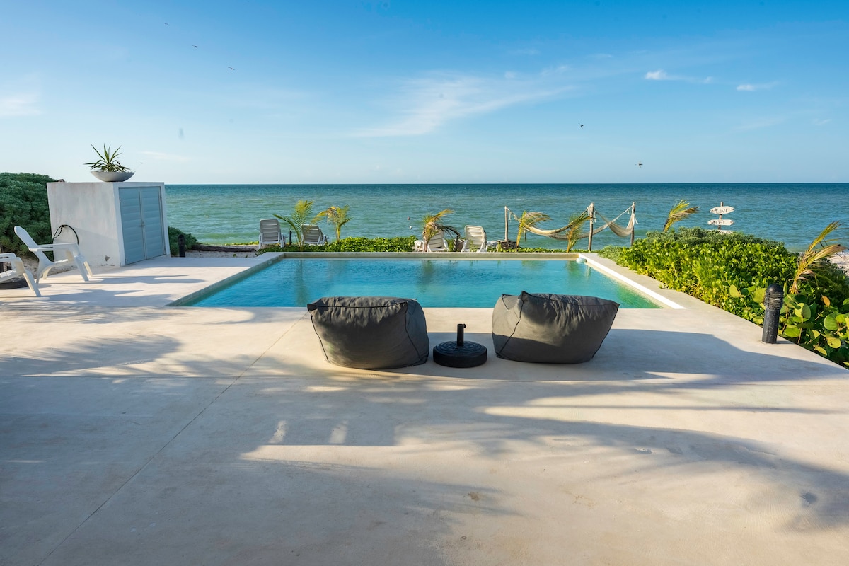 जर तुम्ही विश्रांती, शांतता आणि लाटांच्या आवाजाने झोपण्याचा विचार करत असाल तर आम्ही या व्हिलाला संधी देण्याची शिफारस करतो. बीचवरील युकाटानमधील सर्वात आधुनिक घरांपैकी एकाचा आनंद घेण्यासाठी स्वतंत्र रूम्स आणि कॉमन जागा. मेरिडापासून फक्त 45 मिनिटे आणि प्रोग्रेसोपासून 20 मिनिटे हे तुमच्या कुटुंबासाठी एक छोटेसे नंदनवन आहे. तुमच्या आगमनासाठी आमच्याकडे अनेक ॲक्टिव्हिटीज तयार आहेत. तुमच्यासाठी आणि तुमच्या कुटुंबासाठी खाजगी कॅरिबियनचा आनंद घ्या. कॅनकुन आणि प्लेया डेल कारमेन विमानतळापासून 5 तास