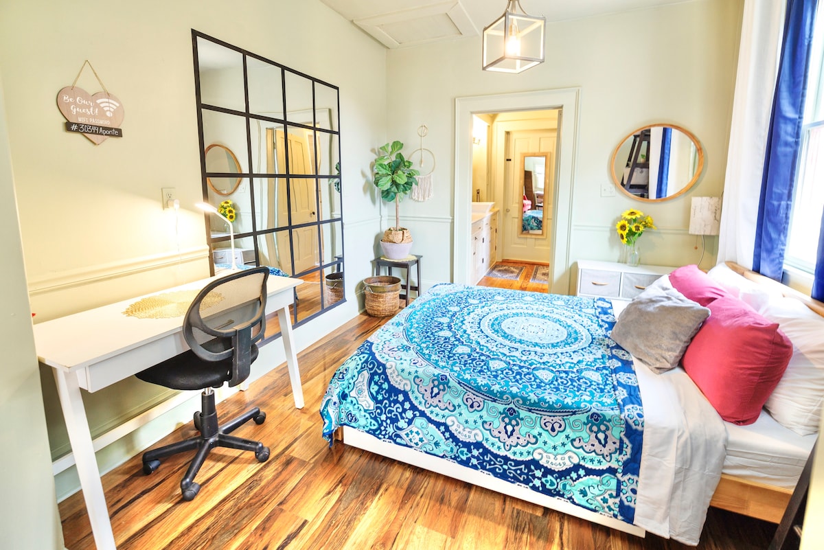 Relax in this private-entry bohemian studio designed for comfort and long-term stays. Enjoy fast WiFi, a dedicated desk, central AC/heat, and a plush memory foam bed. The kitchenette has an air fryer, microwave, coffee maker, mini-fridge, and essentials. Located in a quiet East Point area minutes from the airport and downtown—perfect for travel nurses and remote workers.