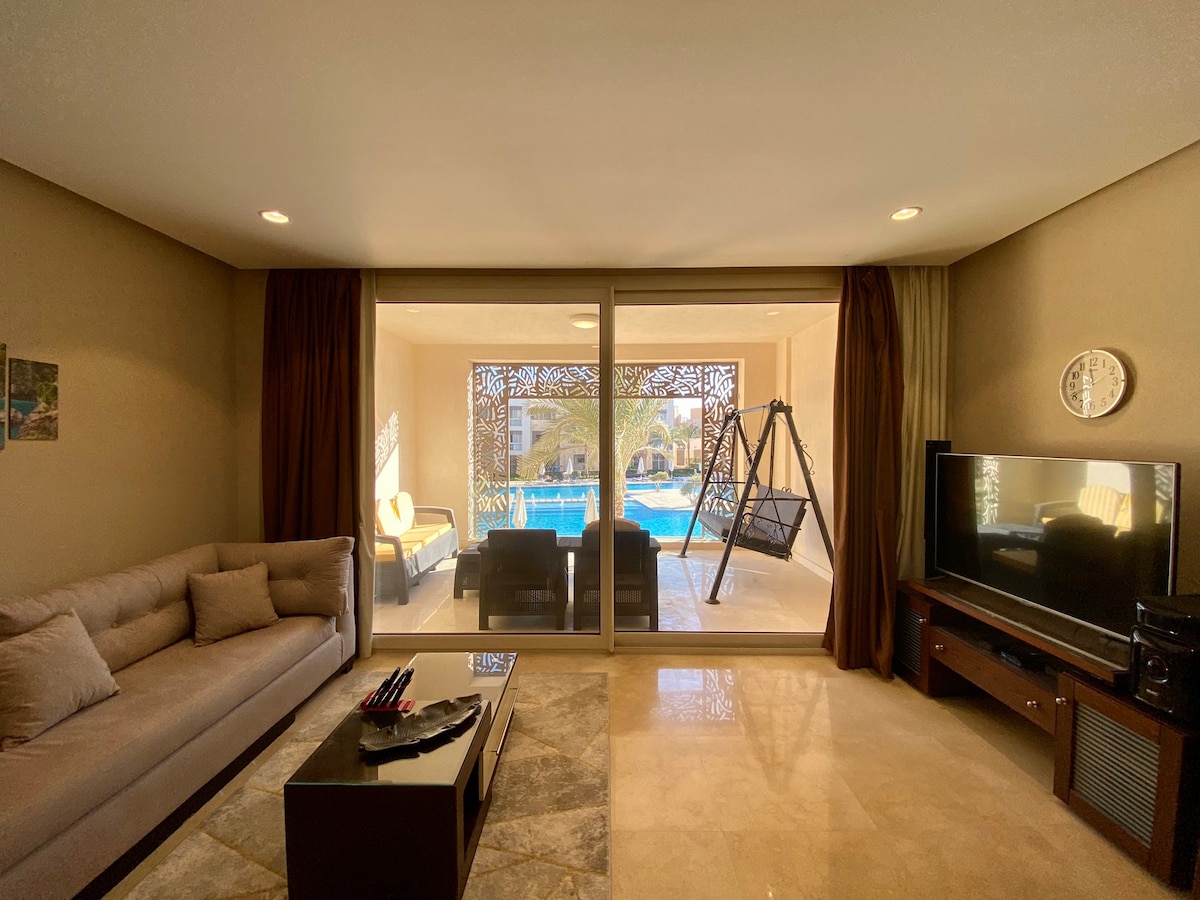 हुरघाडा सुट्ट्या - आधुनिक, बीच फ्रंट, ओपन प्लॅन किचन आणि लिव्हिंग एरियासह सुपर प्रशस्त 90 चौरस मीटर 1BR अपार्टमेंटमध्ये तुमच्या वास्तव्याचा आनंद घ्या, हुरघाडामधील तुमच्या आरामदायक वास्तव्यासाठी सर्व आवश्यक गोष्टींनी पूर्णपणे सुसज्ज. बिग बाल्कनी तुम्हाला सर्वोत्तम थेट समुद्र/पूल व्ह्यूज देते आणि जादुई सूर्योदय पाहण्यासाठी ही आदर्श जागा आहे. खाजगी बीच, सन बेड्स, दोन मोठे स्विमिंग पूल्स, ग्रीन गार्डन, वायफाय 4जी इंटरनेट, 24/7 सुरक्षा आणि आऊटडोअर पार्किंग समाविष्ट आहेत. **भाड्यामध्ये पाणी आणि विजेची बिले समाविष्ट नाहीत.