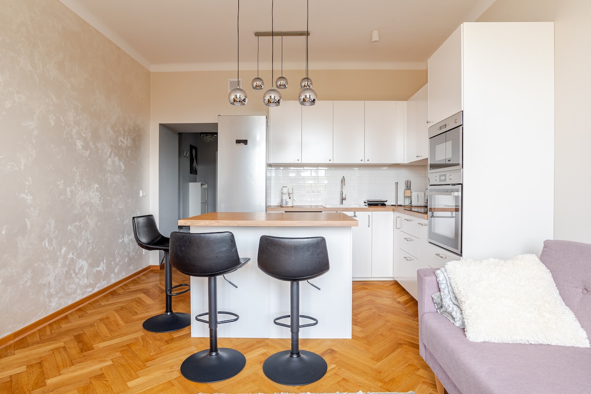 नवीन इमारतीत आरामदायक, पूर्णपणे सुसज्ज अपार्टमेंट. खुले किचन असलेली लिव्हिंग रूम डायनिंग आणि बसण्याच्या जागेमध्ये विभागली गेली आहे. बेडरूममध्ये एक क्वीन बेड आणि एक प्रशस्त कपाट आहे. अतिरिक्त स्टोरेजची जागा म्हणून एक वॉक - इन कपाट देखील आहे. या भागात दुकाने, रेस्टॉरंट्स आणि कॅफे आहेत उपकरणे: एअर कंडिशनिंग, कॉफी मेकर, केटल, इस्त्री बोर्ड, वॉशिंग मशीन चोपिन एयरपोर्टवरून मिळवणे 20 मिनिटांची टॅक्सी 50 मिनिटांचे कम्युनिकेशन मोडलिन एयरपोर्टवरून 50 मिनिटांची टॅक्सी 120 मिनिटांचे कम्युनिकेशन