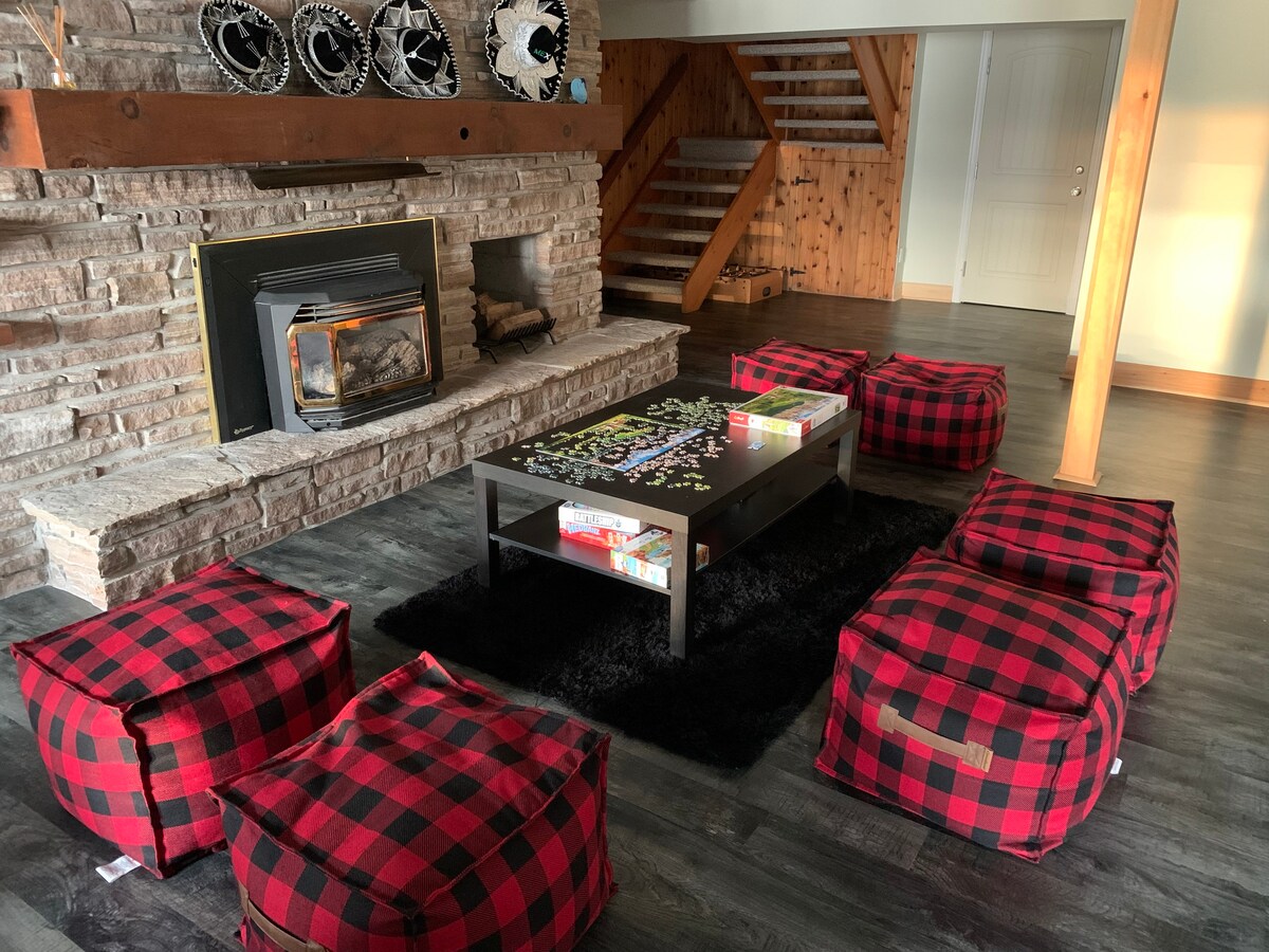 आमच्या 4 सीझन पौदाश लेक कॉटेजमध्ये आपले स्वागत आहे. 3 बेडरूम, कॉटेजमध्ये खुली संकल्पना, एक अप्रतिम मनोरंजन डेक, पूर्णपणे तयार वॉकआऊट तळघर, अप्पर लेव्हल मास्टर बेडरूम , 4 pc बाथरूम, लोअर वॉक आऊट लेव्हल : मोठी रिक रूम, 2 बेडरूम्स. कॉटेजमध्ये तलावाचे अप्रतिम दृश्ये आणि हॉट टब आहेत. हायवे 28 S . स्वच्छ किनारपट्टीपासून दूर उत्तम गोपनीयता आणि सहज ॲक्सेस. मोठा डॉक आणि फ्लोटिंग डॉक, वॉटरफ्रंटजवळील भव्य फायर पिट. 3 ट्रेलर्स पार्क करण्यासाठी स्नोमोबाईल ट्रेल्स आणि रूमचा सहज ॲक्सेस