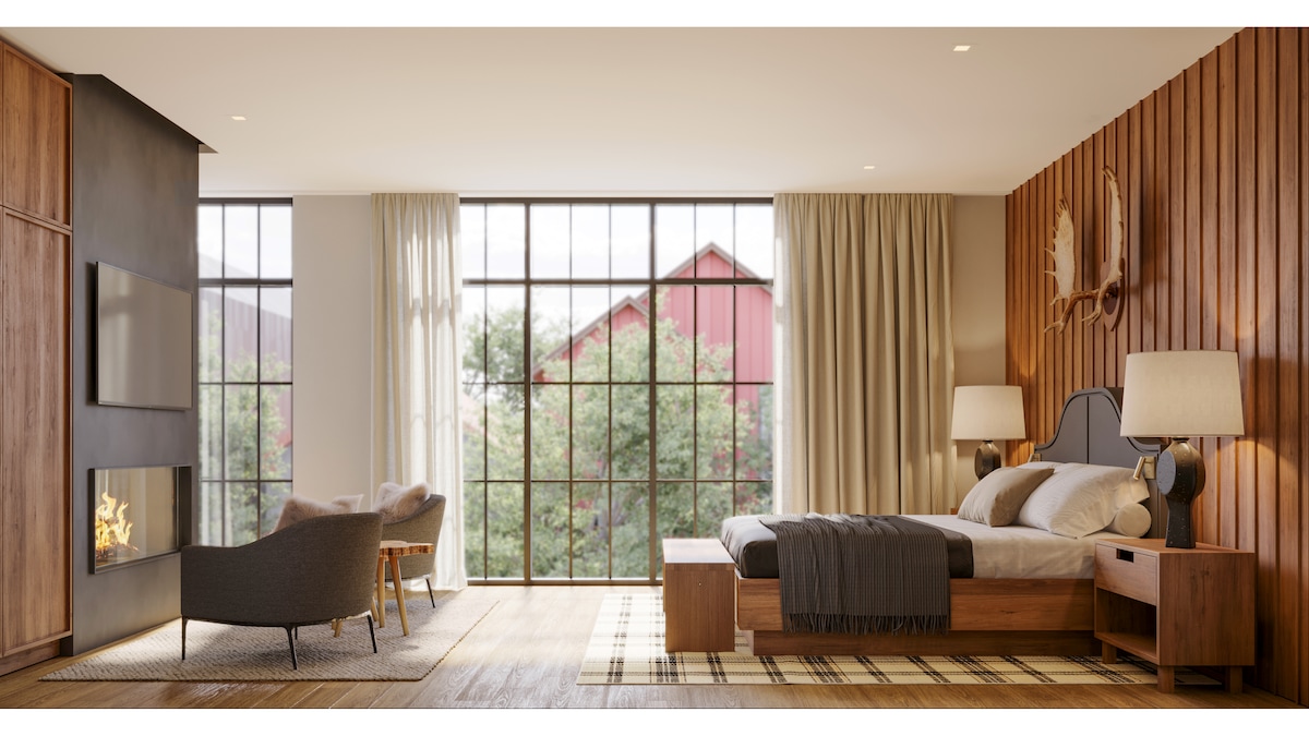 Cabin Suite F1, located on the main level of Cabin F, is among the most spacious and private accommodations on the property. This space features a private stoop overlooking the surrounding Railway District, a large bedroom with a private fireplace, and the generous bathroom features a walk-in shower and double vanities.