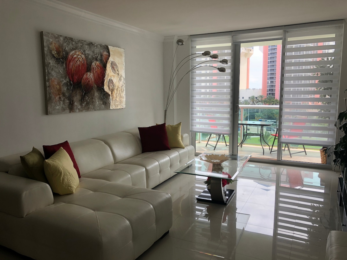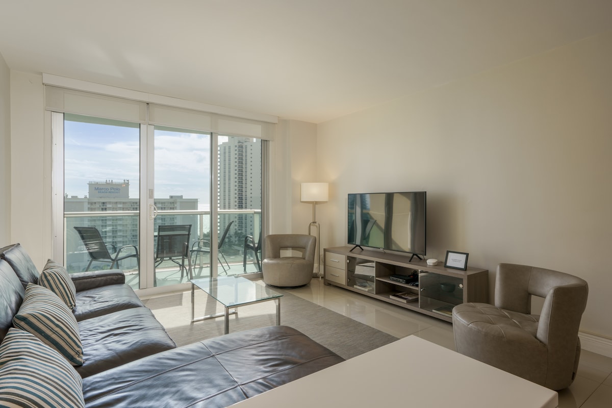 पूर्णपणे सुसज्ज अपार्टमेंट, सनी आयलँड्स बीचमधील कॉलिन्स ॲव्हेन्यूवर अद्भुत समुद्राच्या दृश्यासह आधुनिक आणि प्रशस्त. उत्कृष्ट लोकेशन, बीचपासून थोडेसे चालण्याचे अंतर, 5 मिनिटे. Aventura मॉलकडे ड्राईव्ह करा, 35 मिनिटे. मियामी आंतरराष्ट्रीय विमानतळ/फोर्ट लॉडरडेल विमानतळाकडे जा, 40 मिनिटे. डॉल्फिन मॉलकडे ड्राईव्ह करा आणि 30 मिनिटे. सॉग्रास मिल्सपर्यंत ड्राईव्ह करा. अपार्टमेंटमध्ये 2 मोठ्या बेडरूम्स आहेत, एक 2 किंग बेड्ससह आणि दुसरा 2 क्वीन बेड्स आणि एक स्लीपर - सोफा आहे. प्रत्येक रूममध्ये टीव्ही आणि विनामूल्य वायफाय आहे.